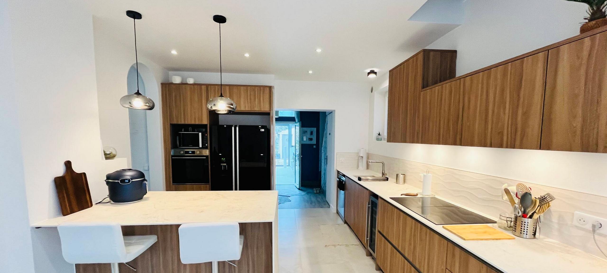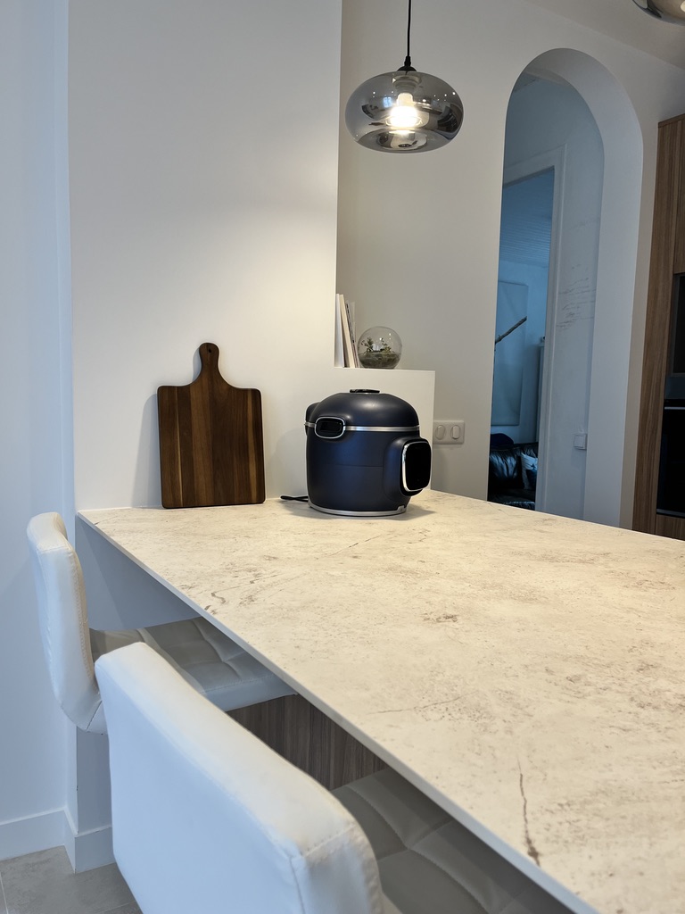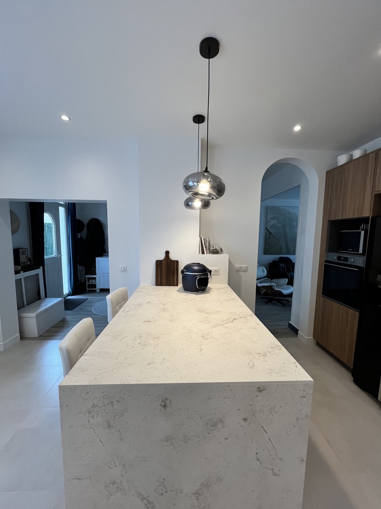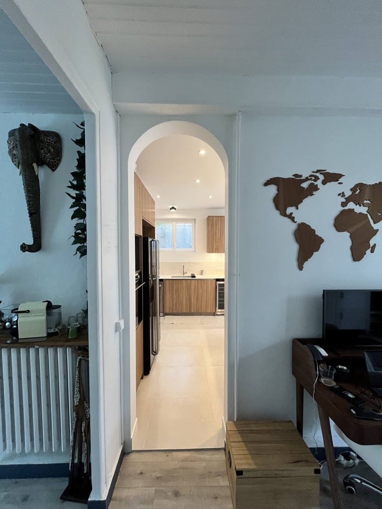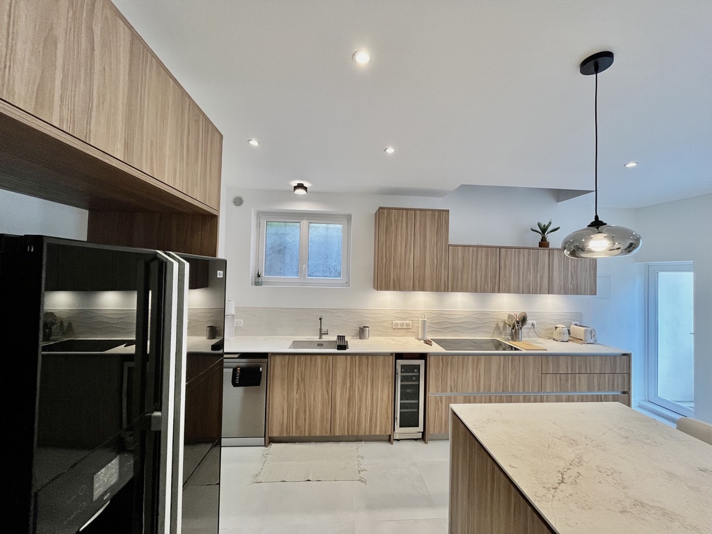 Entièrement repensé, cet espace a gagné en volume et en lumière grâce à la dépose de la cloison entre l’ancienne cuisine et l’ancienne salle à manger. L’aménagement a été conçu pour favoriser une circulation fluide autour d’une cuisine fonctionnelle et ergonomique. Le large plan de travail est aussi pratique qu’agréable à vivre. Désormais, cette grande pièce est devenue le cœur de la maison, propice aux moments partagés.