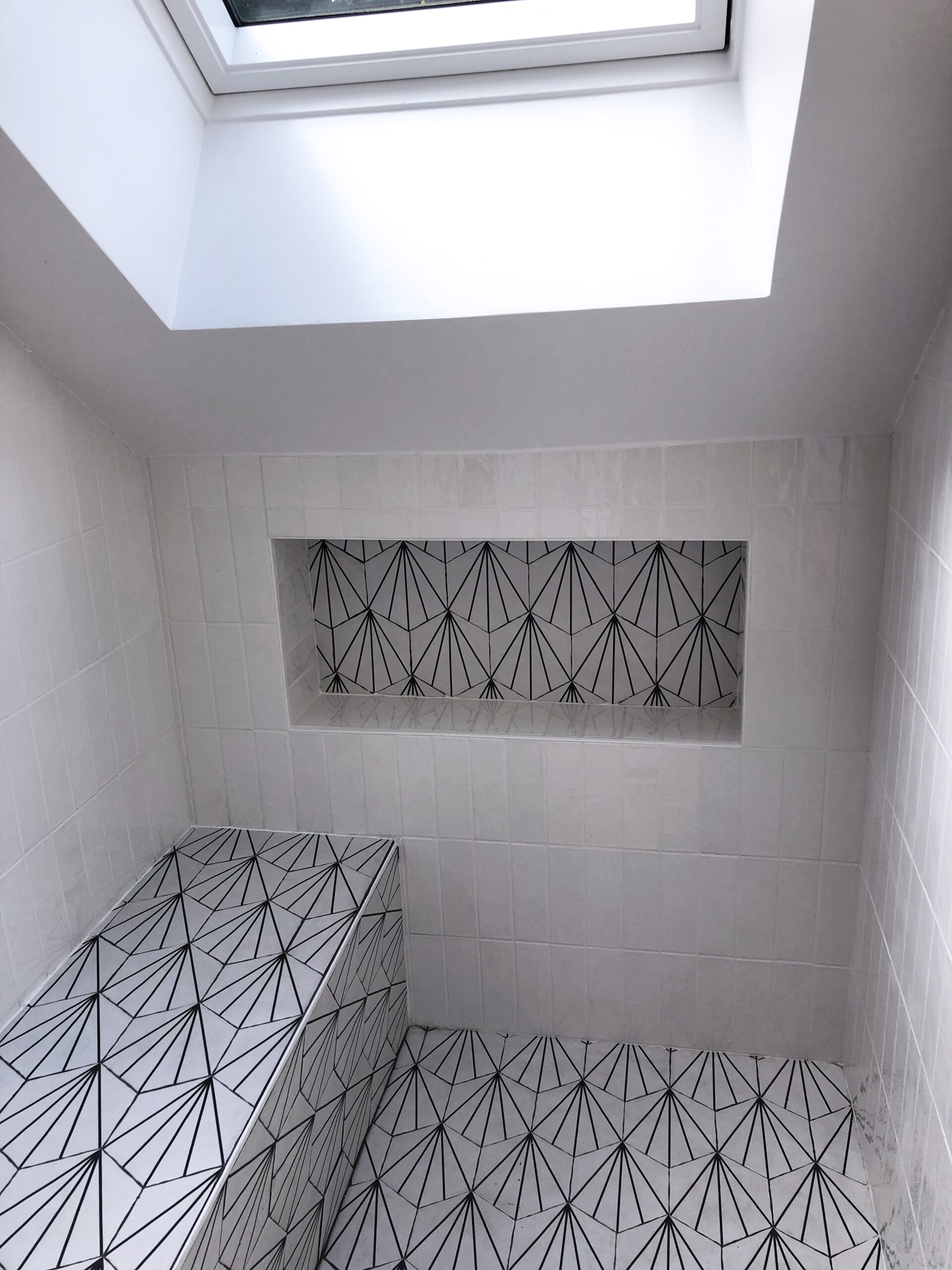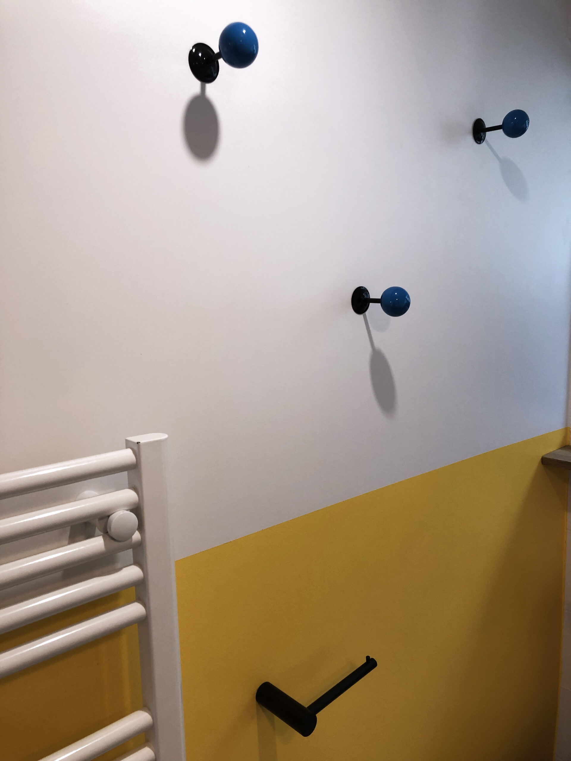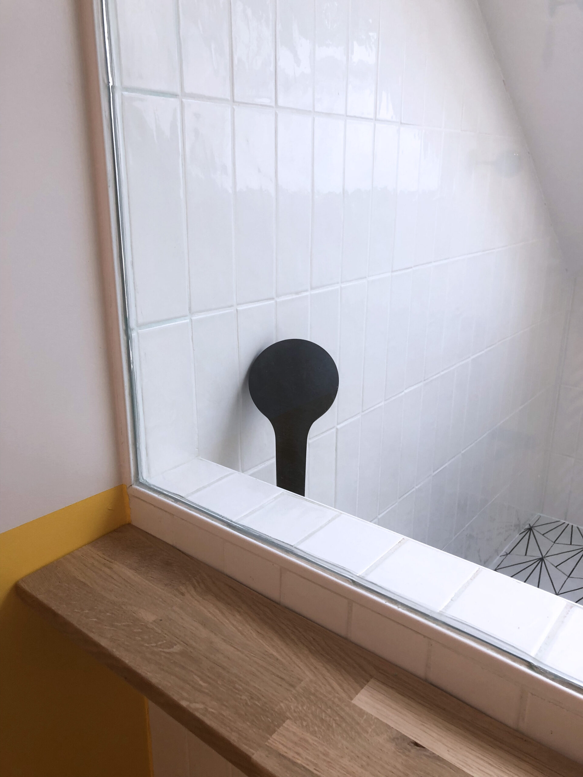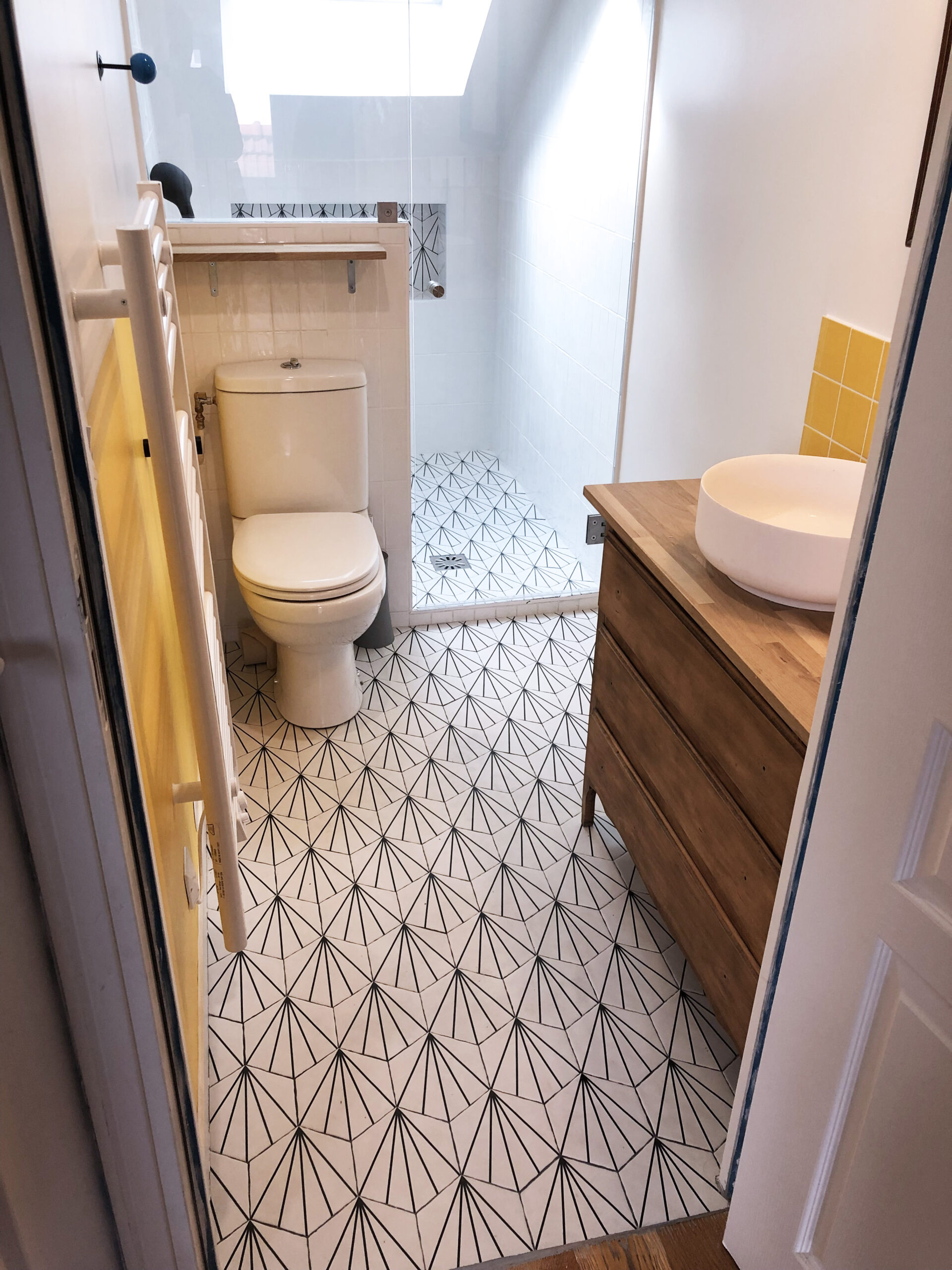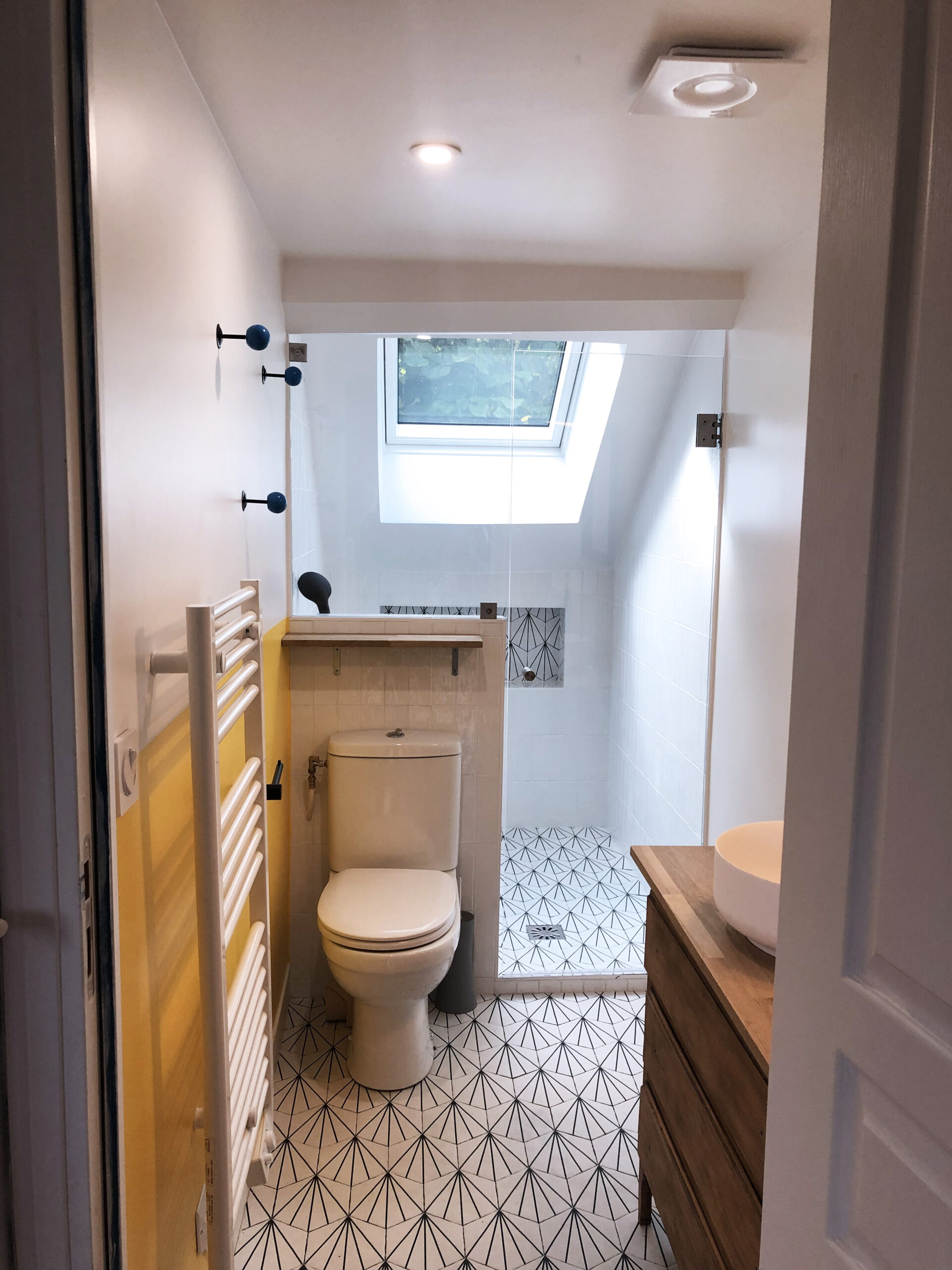 Sous la pente, l’ancienne mini salle de bain désuée a laissé place à une mini salle d’eau pleine de caractère. La baignoire encombrante a disparu au profit d’une grande douche fonctionnelle, lumineuse et confortable. Le carrelage graphique, résolument actuel, est réveillé par des patères colorées qui insufflent dynamisme et bonne humeur. Pour parfaire l’ensemble, une commode chinée a été transformée en meuble vasque, apportant style, authenticité et personnalité à cet espace de bien-être moderne et éclatant.