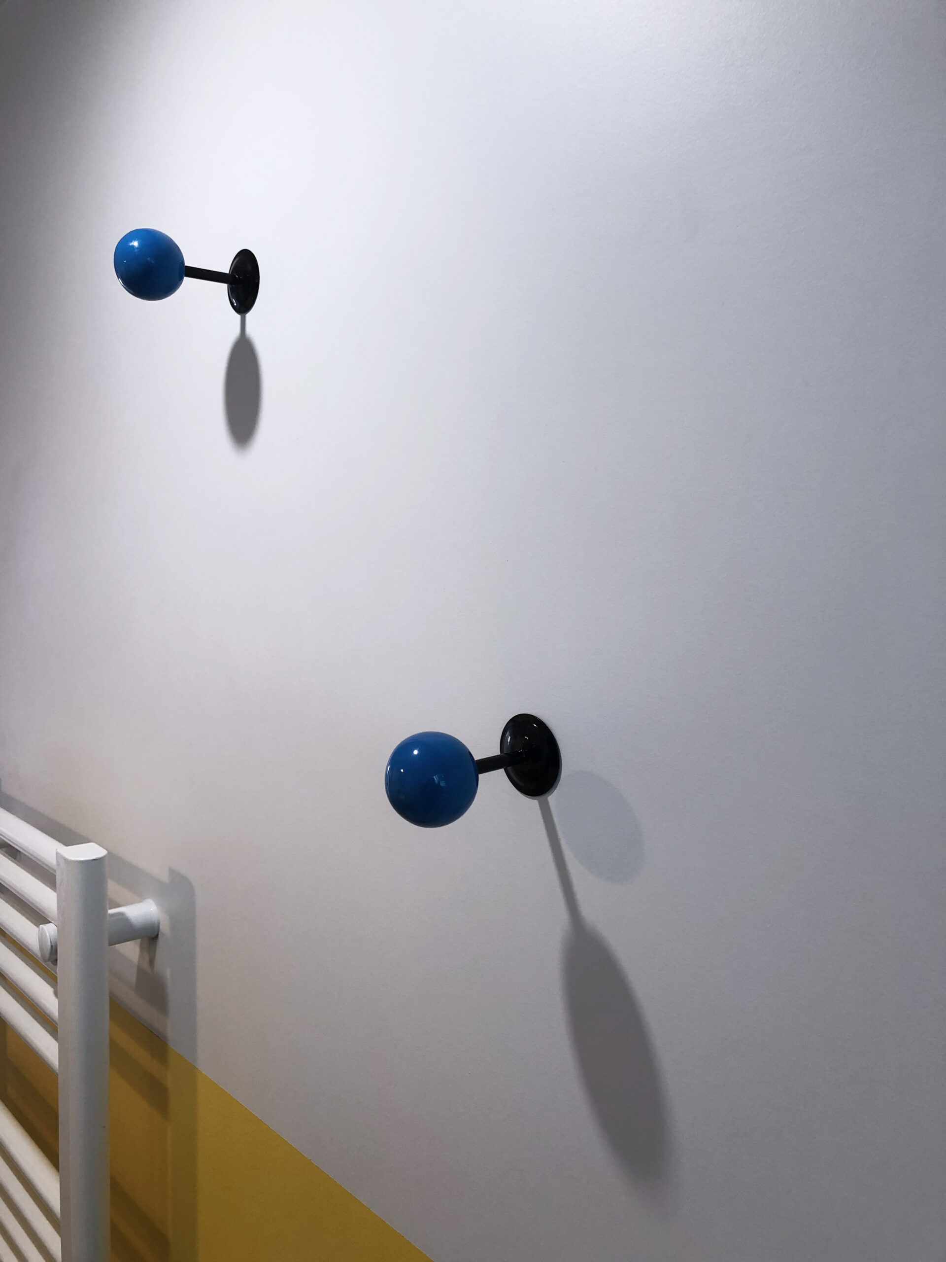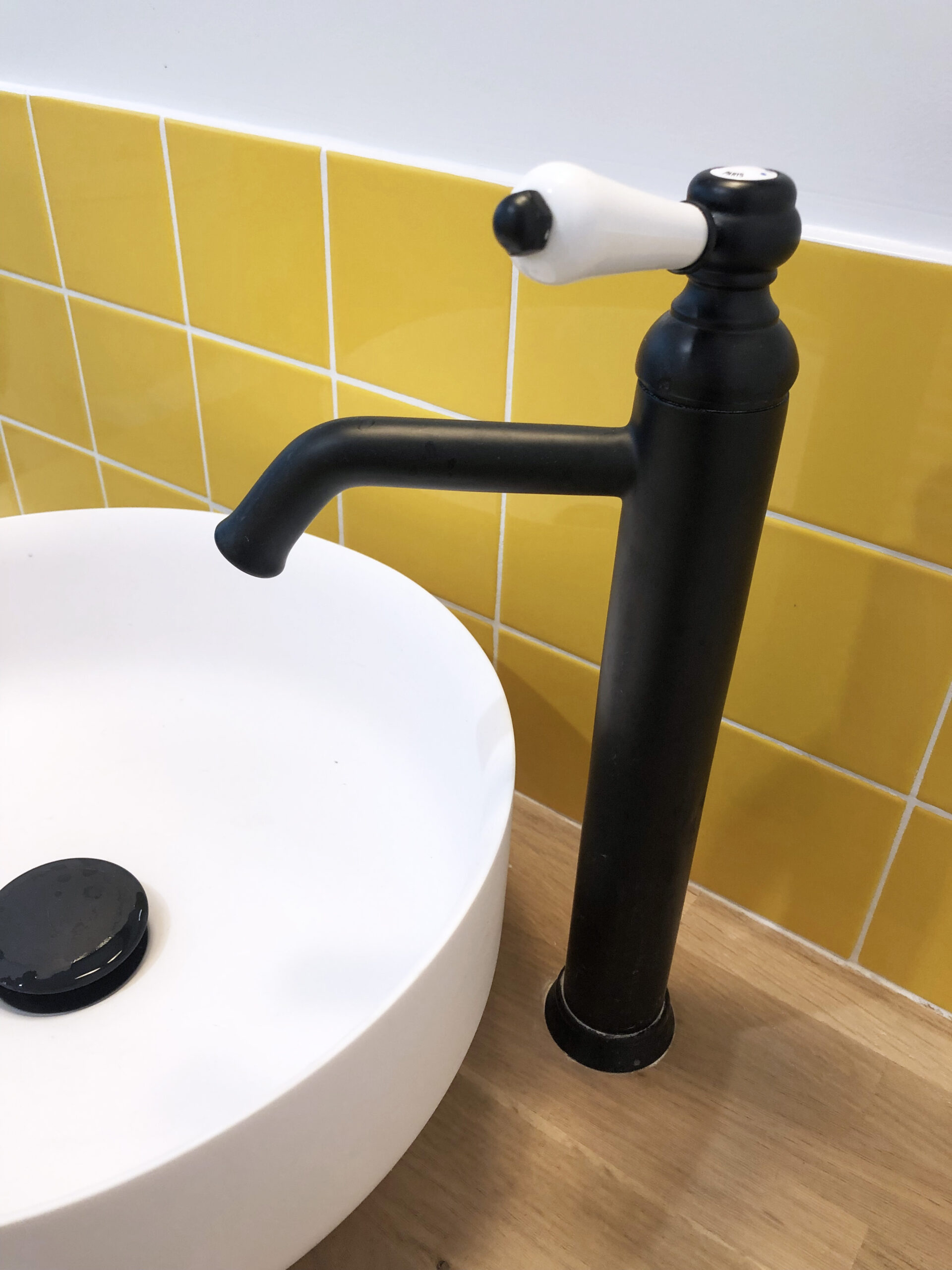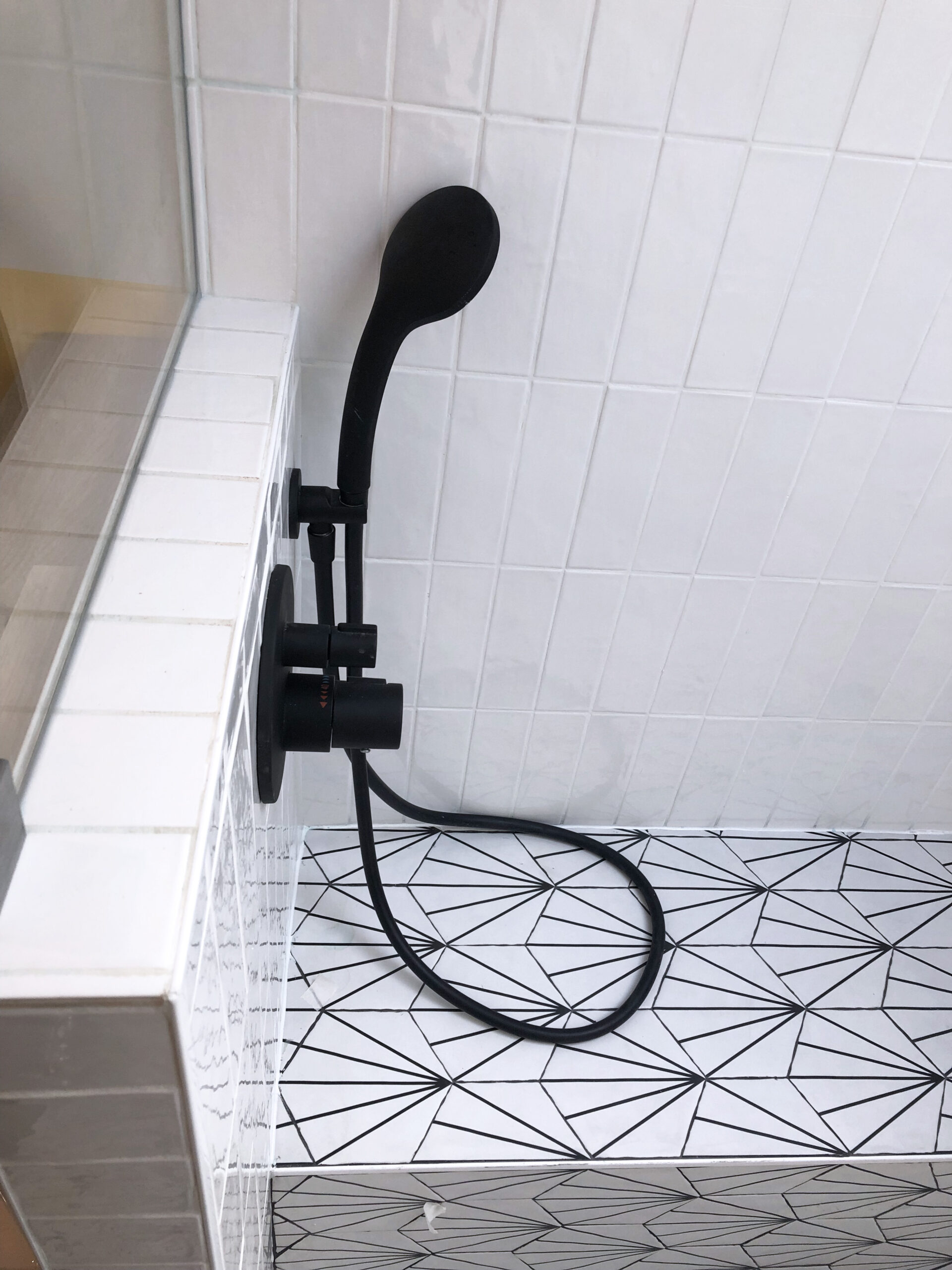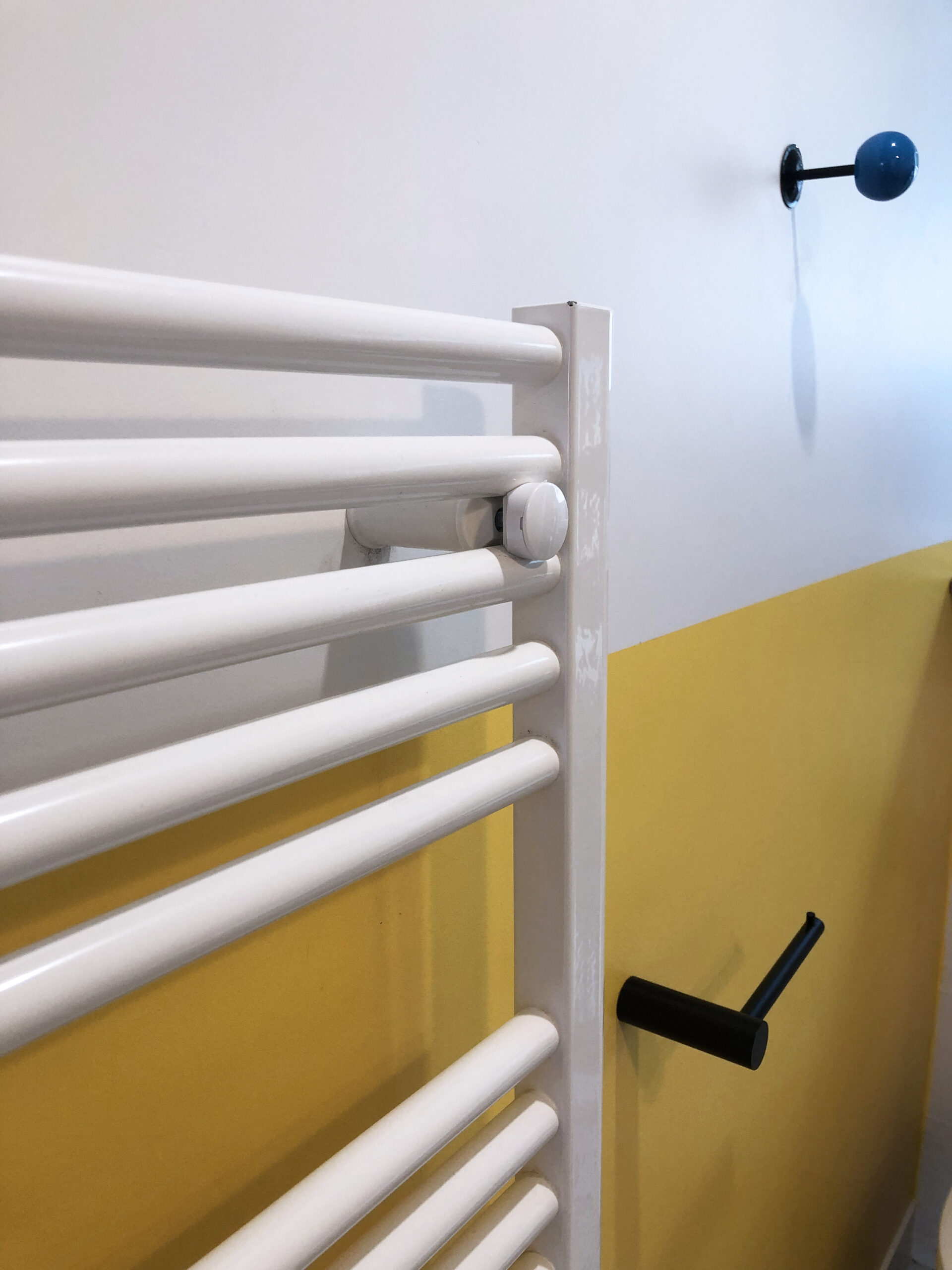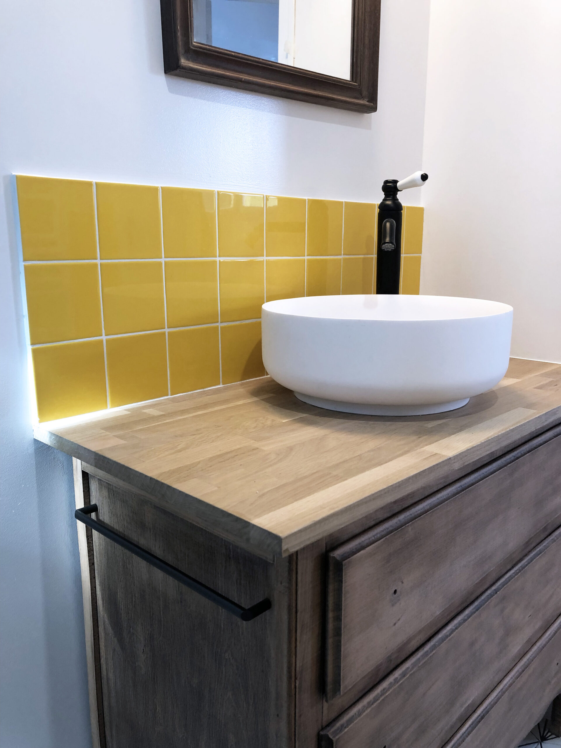 Sous la pente, l’ancienne mini salle de bain désuée a laissé place à une mini salle d’eau pleine de caractère. La baignoire encombrante a disparu au profit d’une grande douche fonctionnelle, lumineuse et confortable. Le carrelage graphique, résolument actuel, est réveillé par des patères colorées qui insufflent dynamisme et bonne humeur. Pour parfaire l’ensemble, une commode chinée a été transformée en meuble vasque, apportant style, authenticité et personnalité à cet espace de bien-être moderne et éclatant.