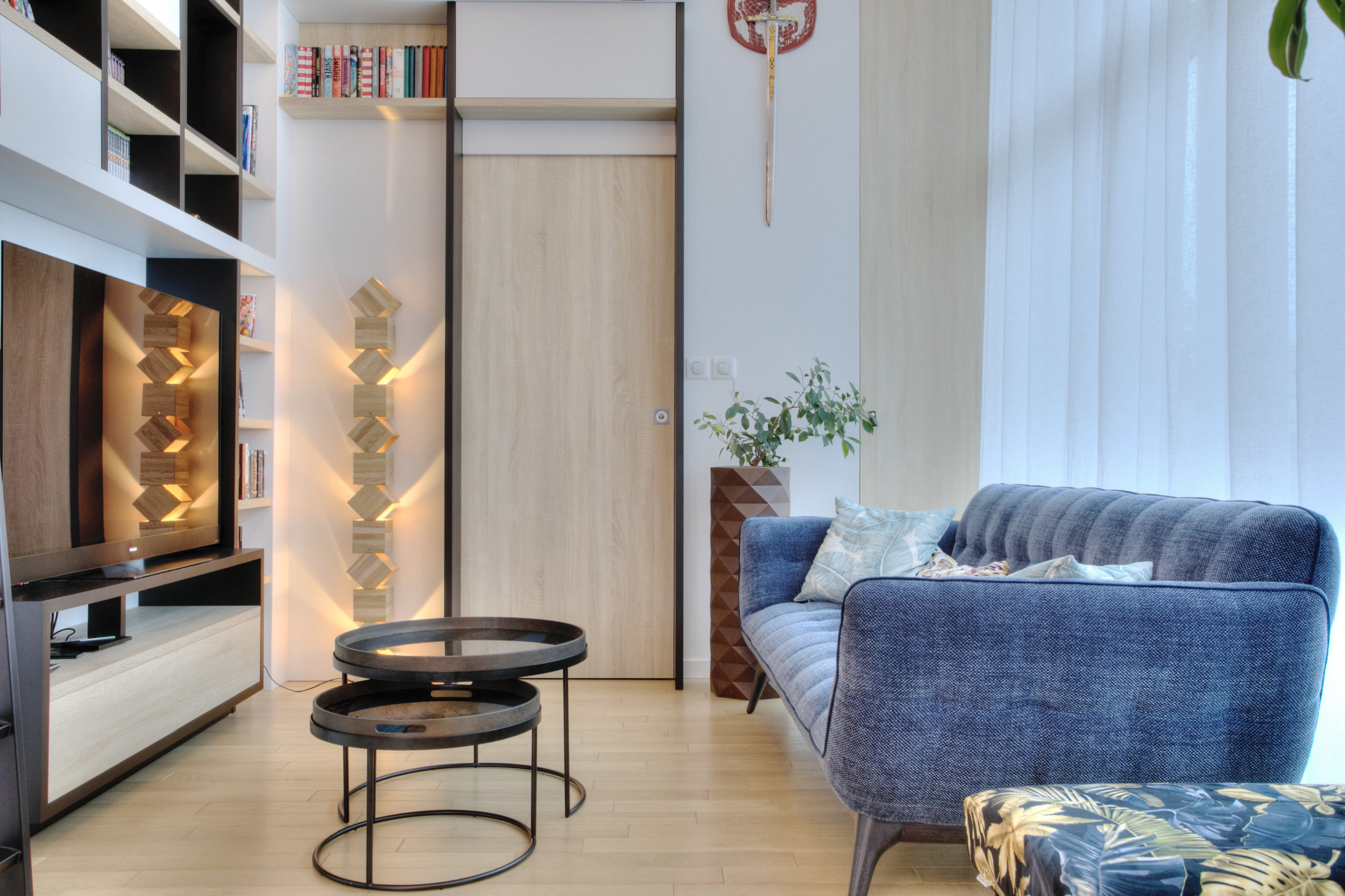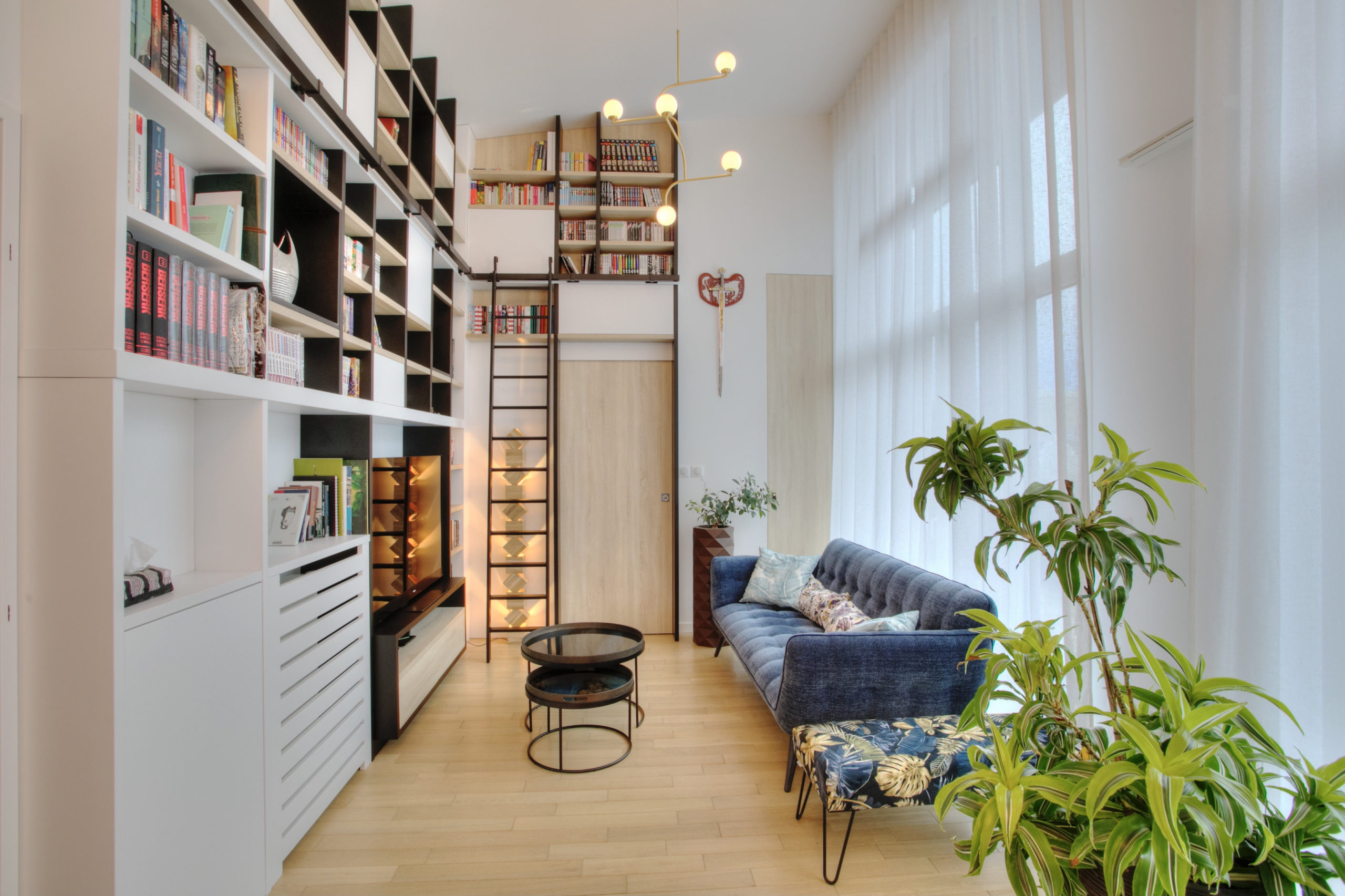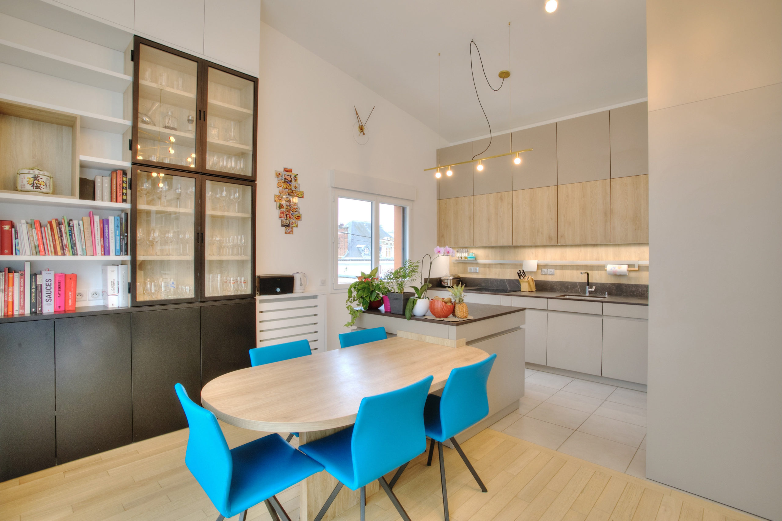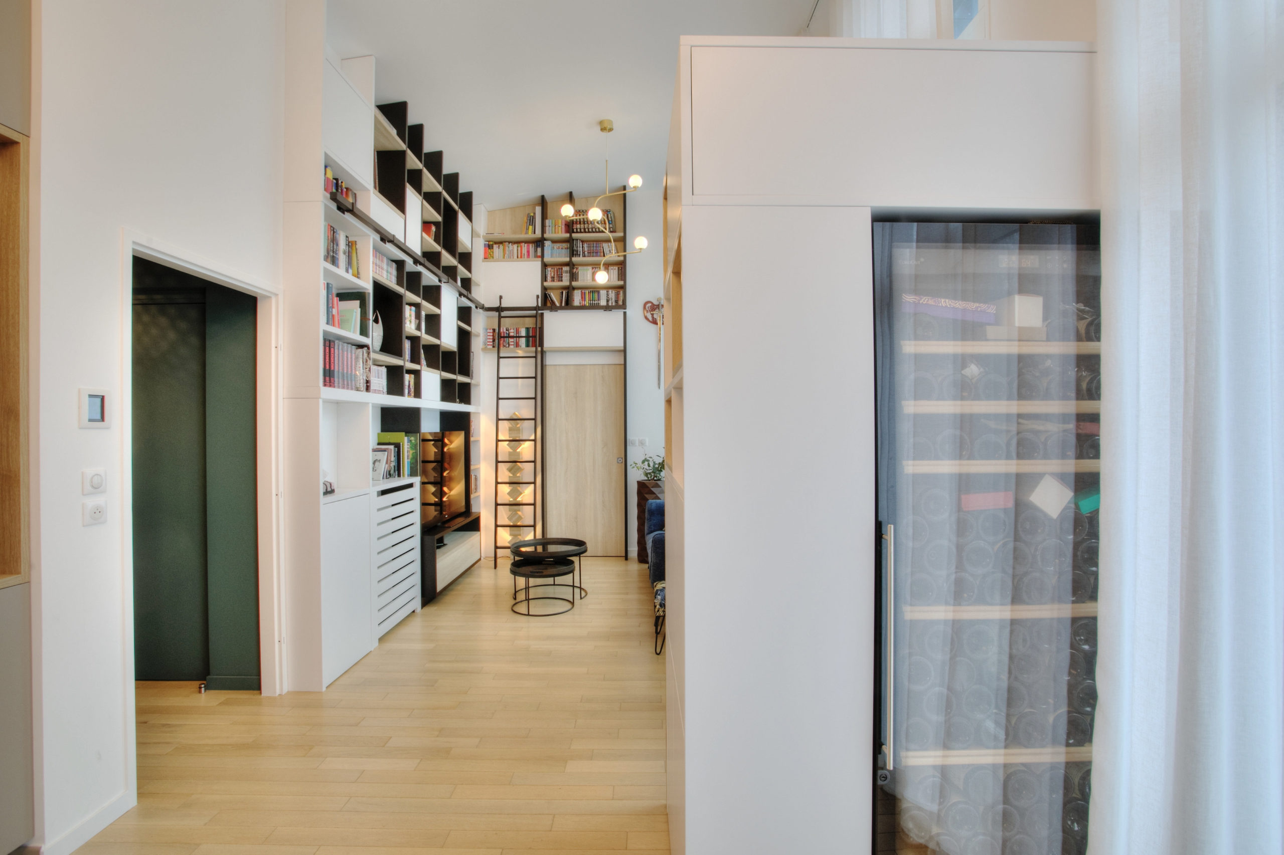 Cet appartement a fait l’objet d’un réaménagement complet, pensé pour optimiser chaque mètre carré et révéler tout le potentiel de la hauteur sous plafond. Les espaces de vie ont été redessinés autour d’une cuisine ouverte et conviviale, baignée de lumière naturelle. L’aménagement sur-mesure et les choix subtils de mobilier et de luminaires confèrent à l’ensemble une atmosphère d’élégance et de raffinement. Véritable pièce maitresse du séjour, la très grande et majestueuse bibliothèque structure l’espace et donne du caractère. Ici, confort, fonctionnalité et esthétique se rencontrent avec justesse.