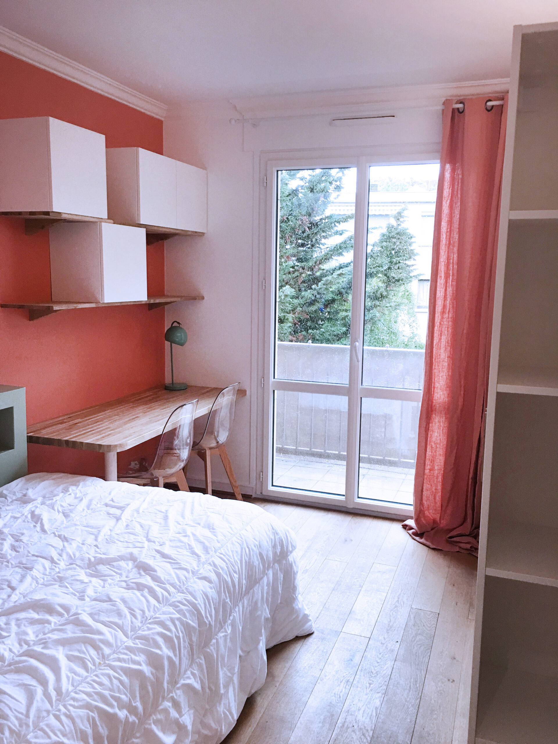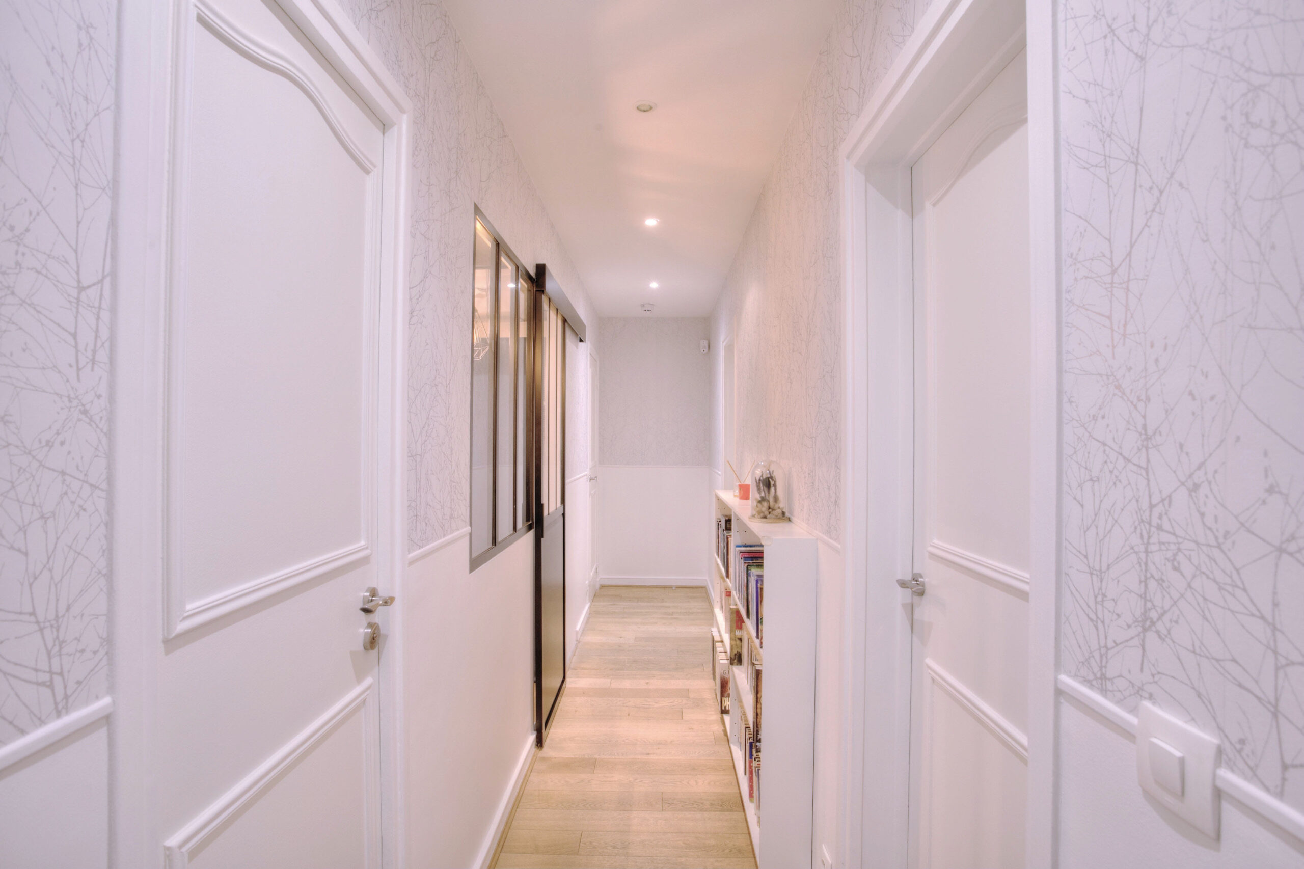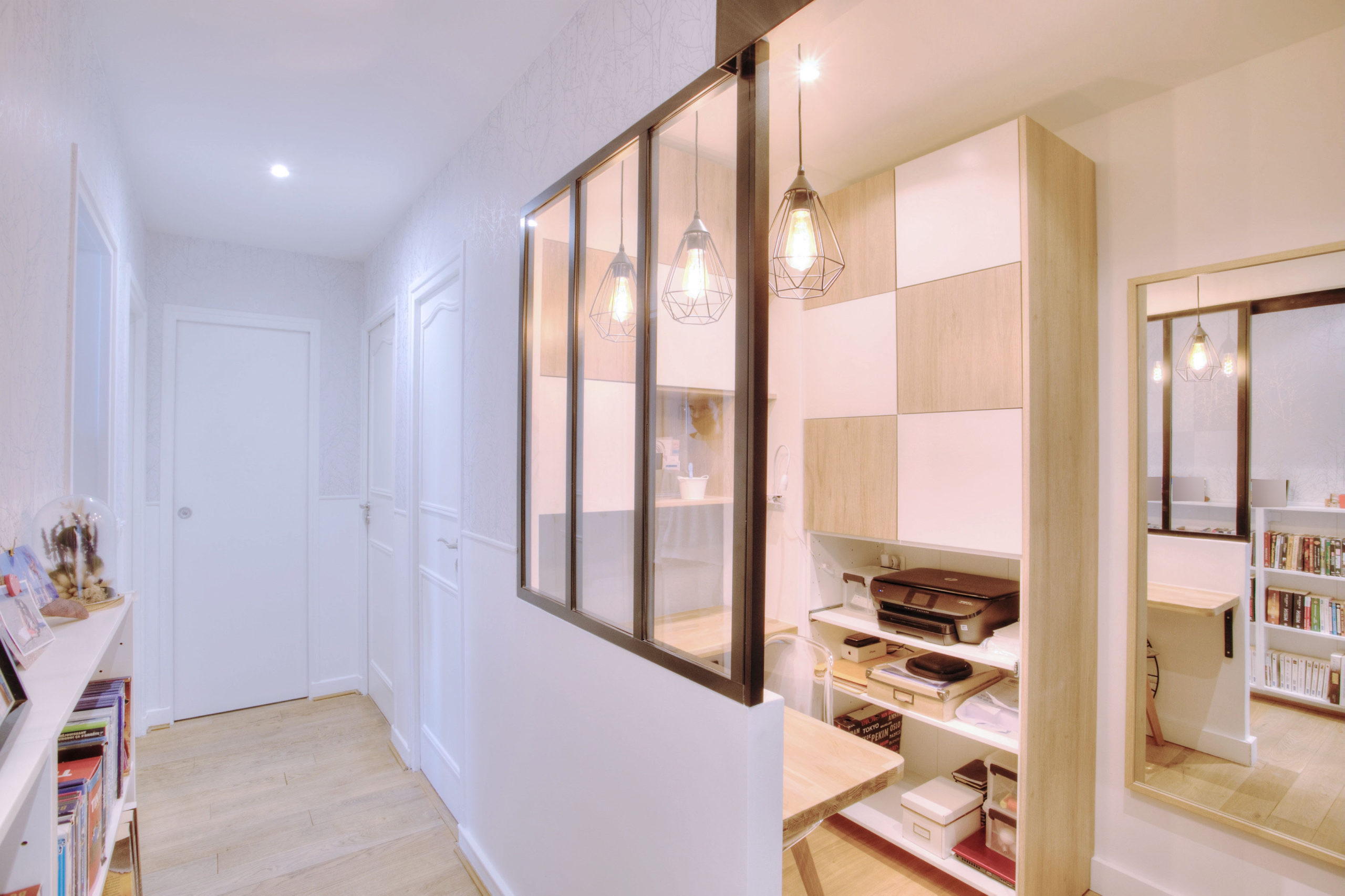 Ce coin nuit regroupe trois chambres aux ambiances distinctes, chacune conçue selon les besoins et la personnalité de ses occupants. Le couloir, devenu lumineux, assure la transition entre les différentes pièces. L’ancien dressing a laissé place à un bureau ouvert sur le couloir et très fonctionnel. Un coin nuit qui conjugue harmonie et individualité.