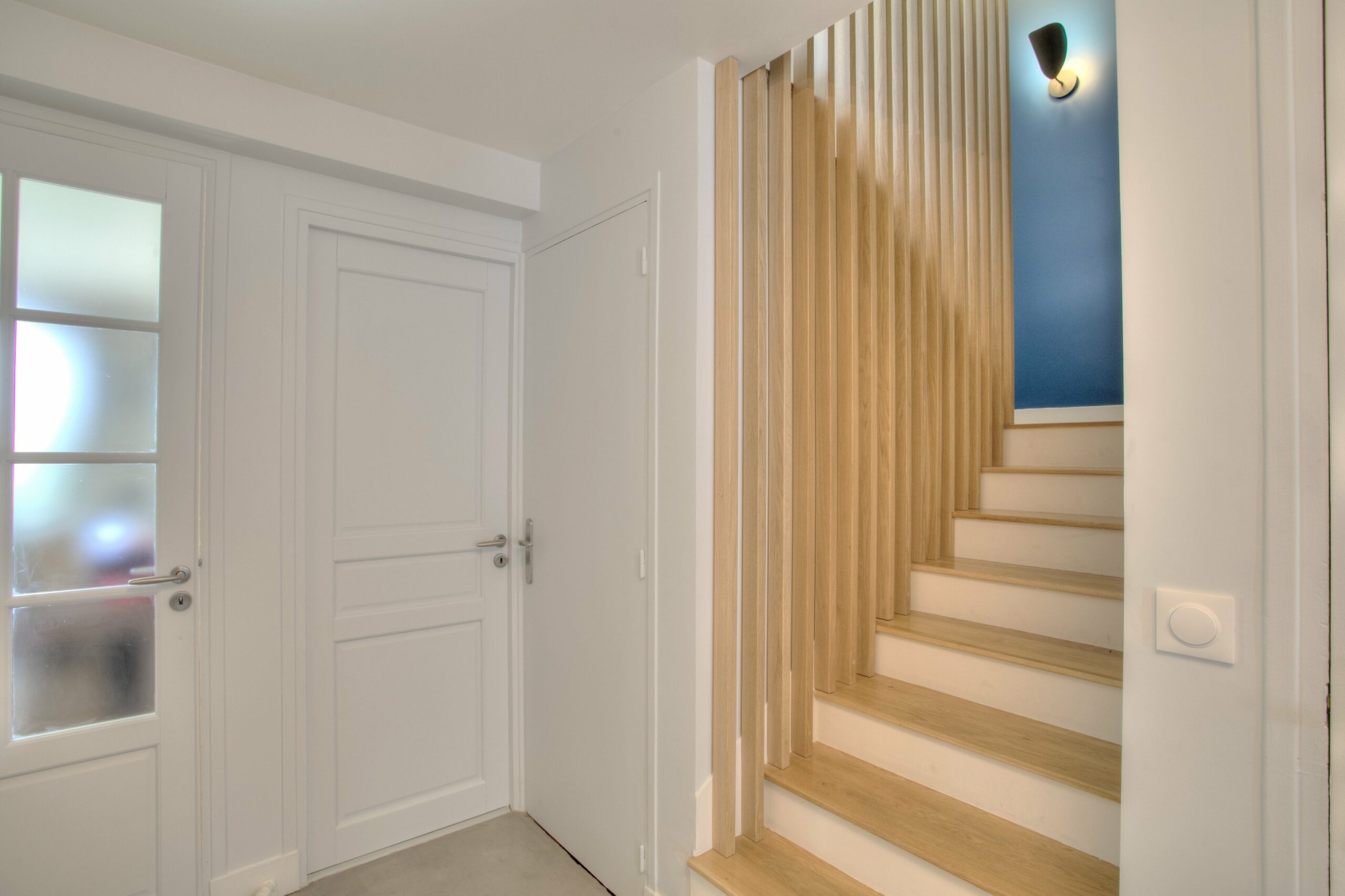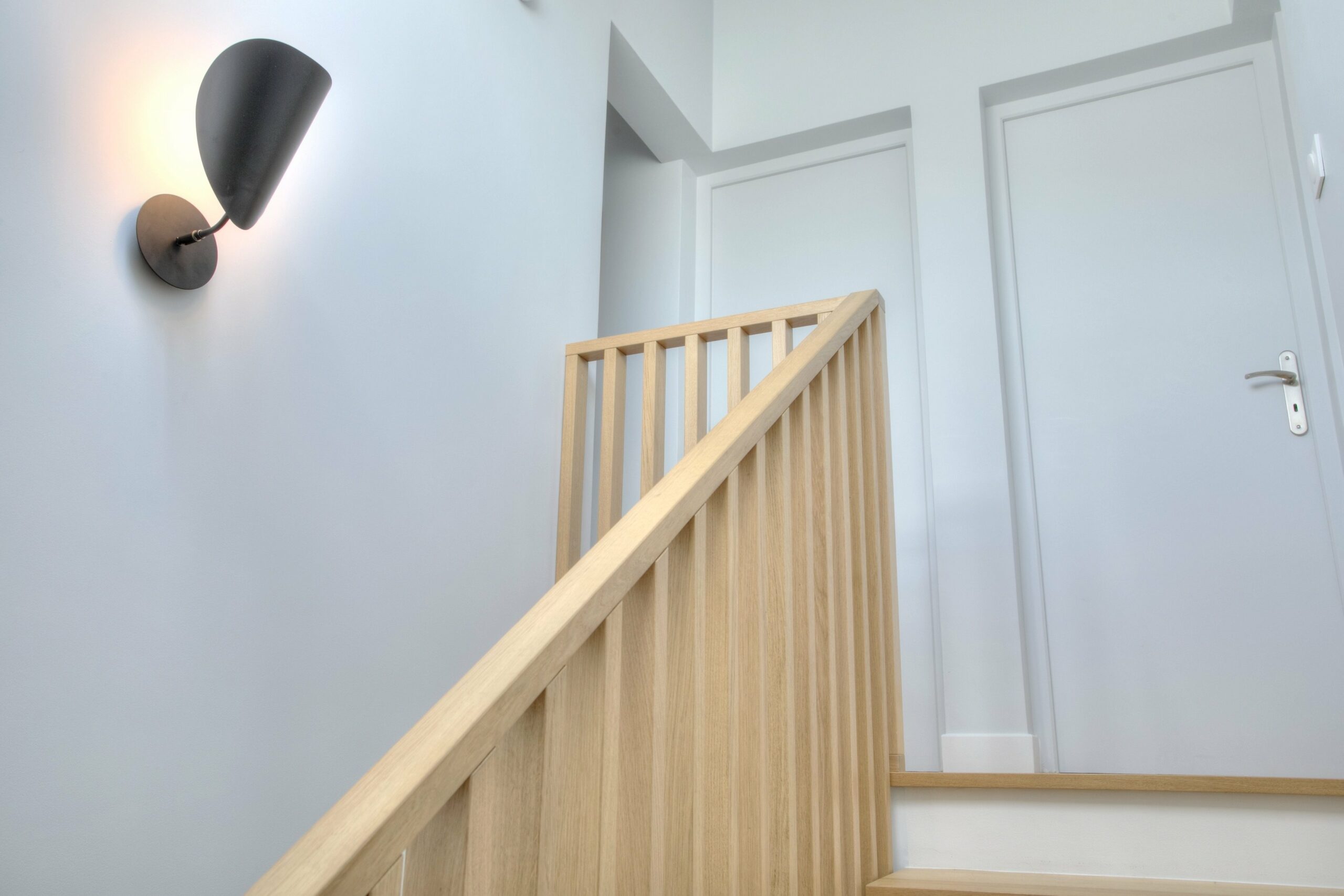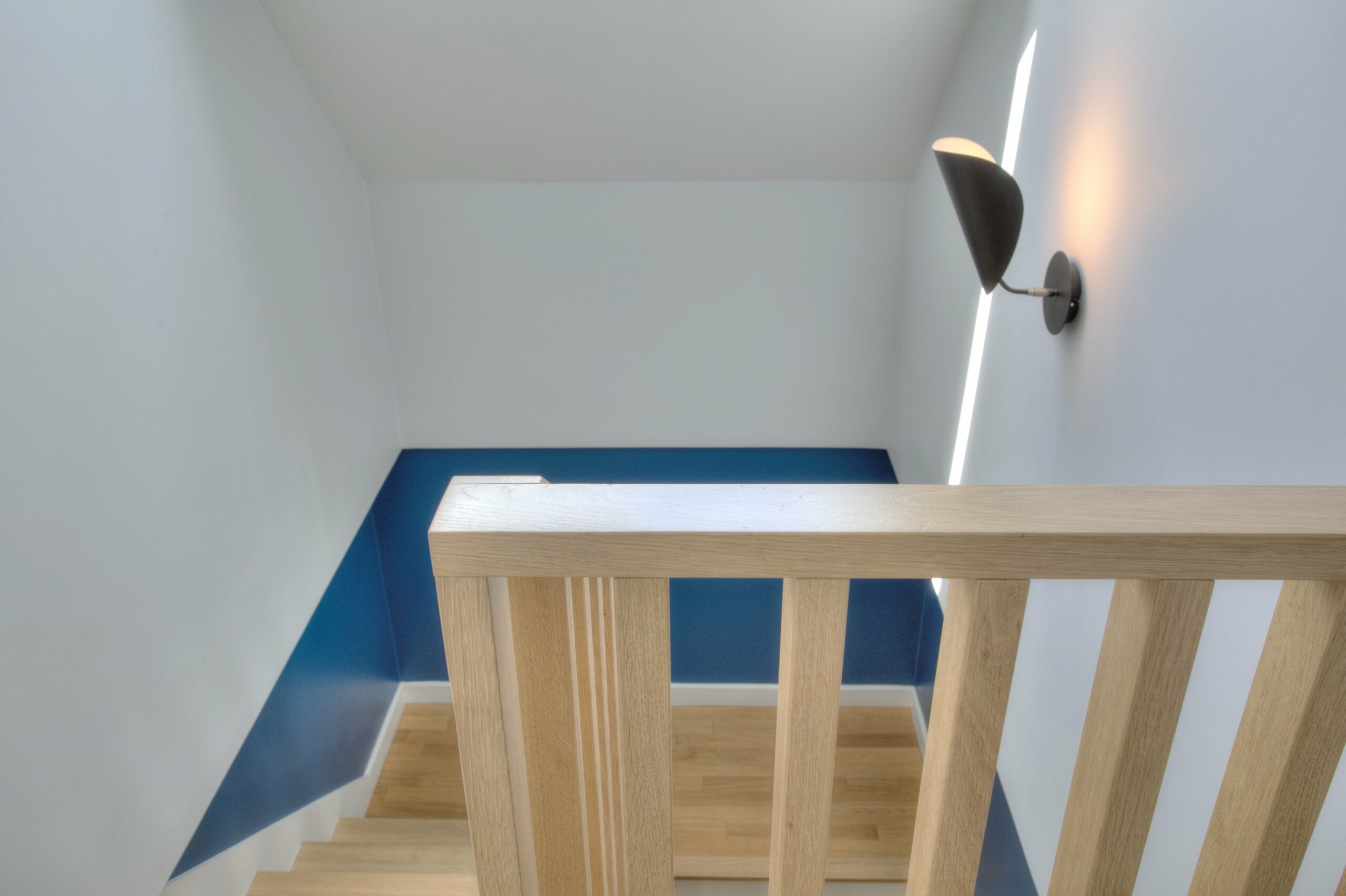 Dès l’entrée, les lignes simples et modernes du placard toute hauteur donnent le ton. Il apporte une impression de volume et  structure l’espace avec finesse en offrant un rangement optimisé et discret. Les finitions sont soignées. La cage d’escalier parée d’un garde-corps en bois sur mesure est sans aucun doute la pièce maîtresse du projet.  Il inspire élégance et légèreté au travers sa verticalité et devient un élément décoratif à part entière.
