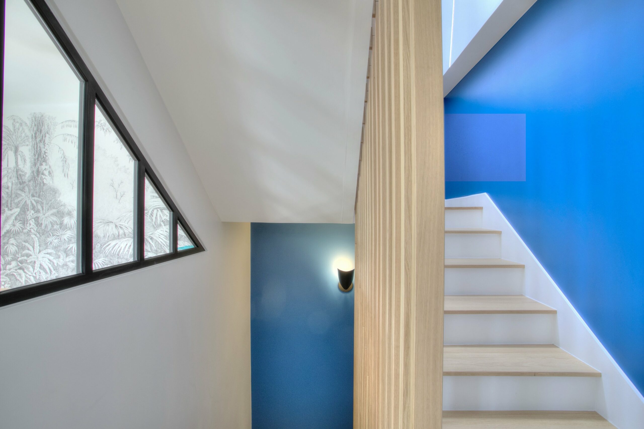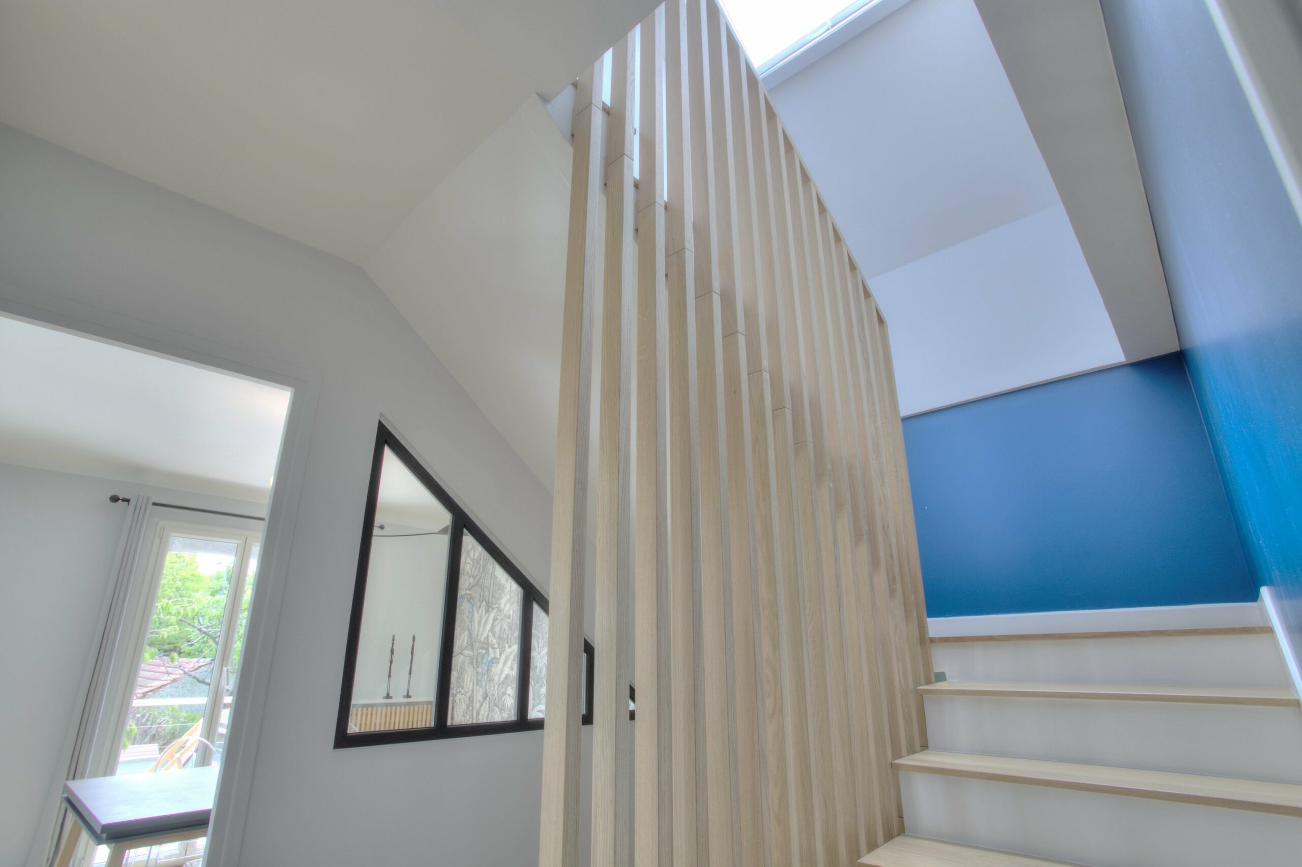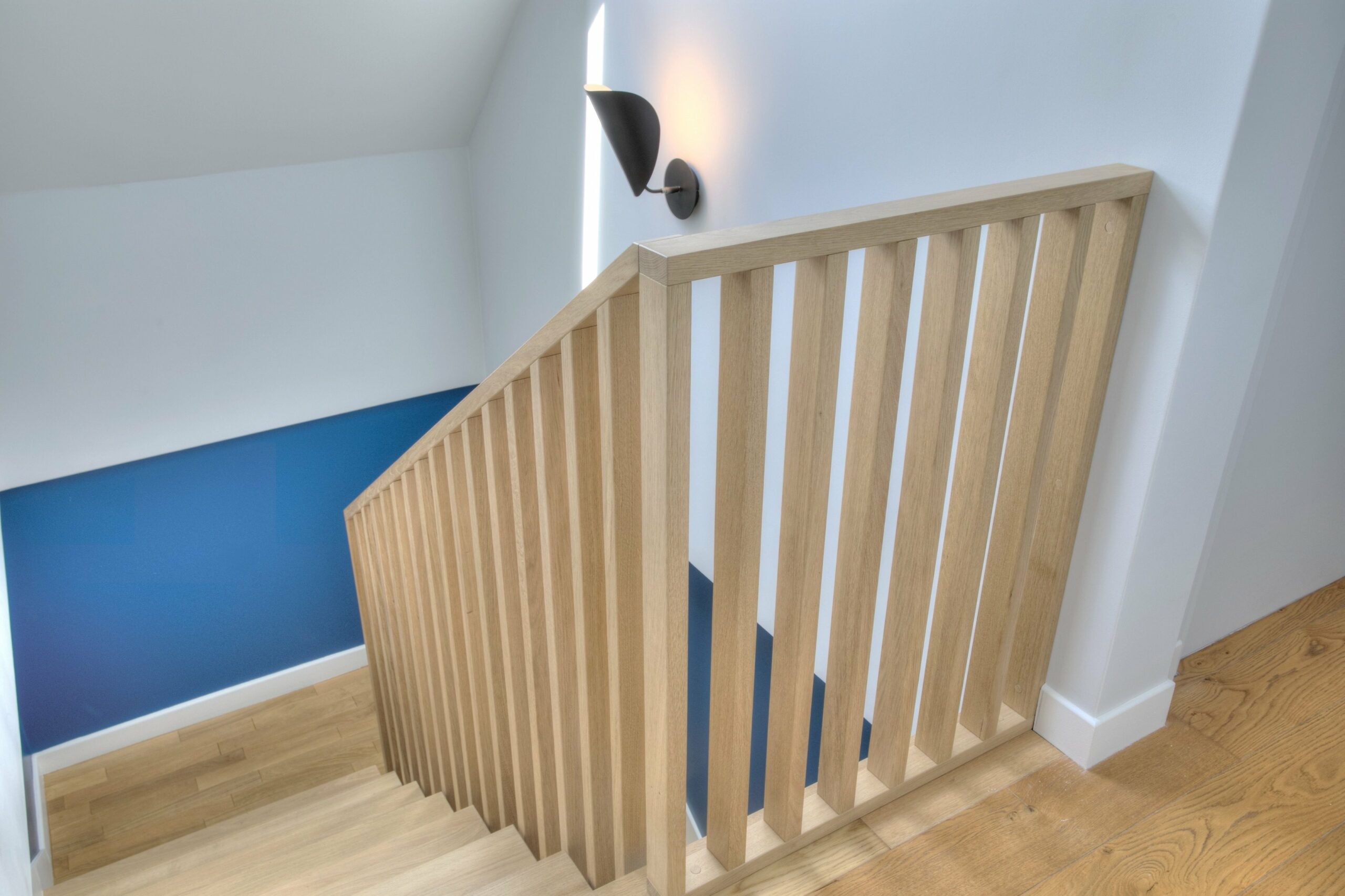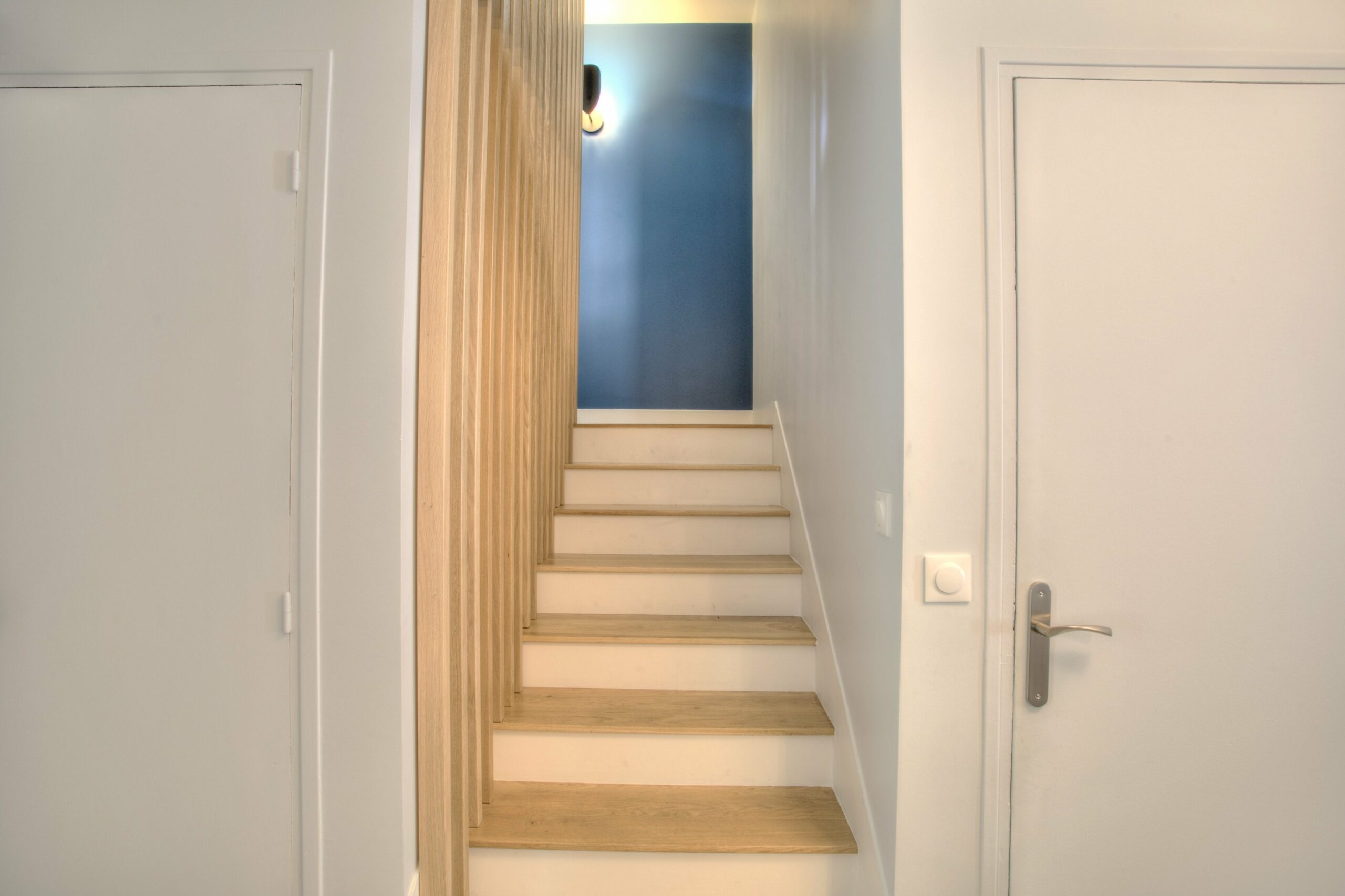 Dès l’entrée, les lignes simples et modernes du placard toute hauteur donnent le ton. Il apporte une impression de volume et  structure l’espace avec finesse en offrant un rangement optimisé et discret. Les finitions sont soignées. La cage d’escalier parée d’un garde-corps en bois sur mesure est sans aucun doute la pièce maîtresse du projet.  Il inspire élégance et légèreté au travers sa verticalité et devient un élément décoratif à part entière.
