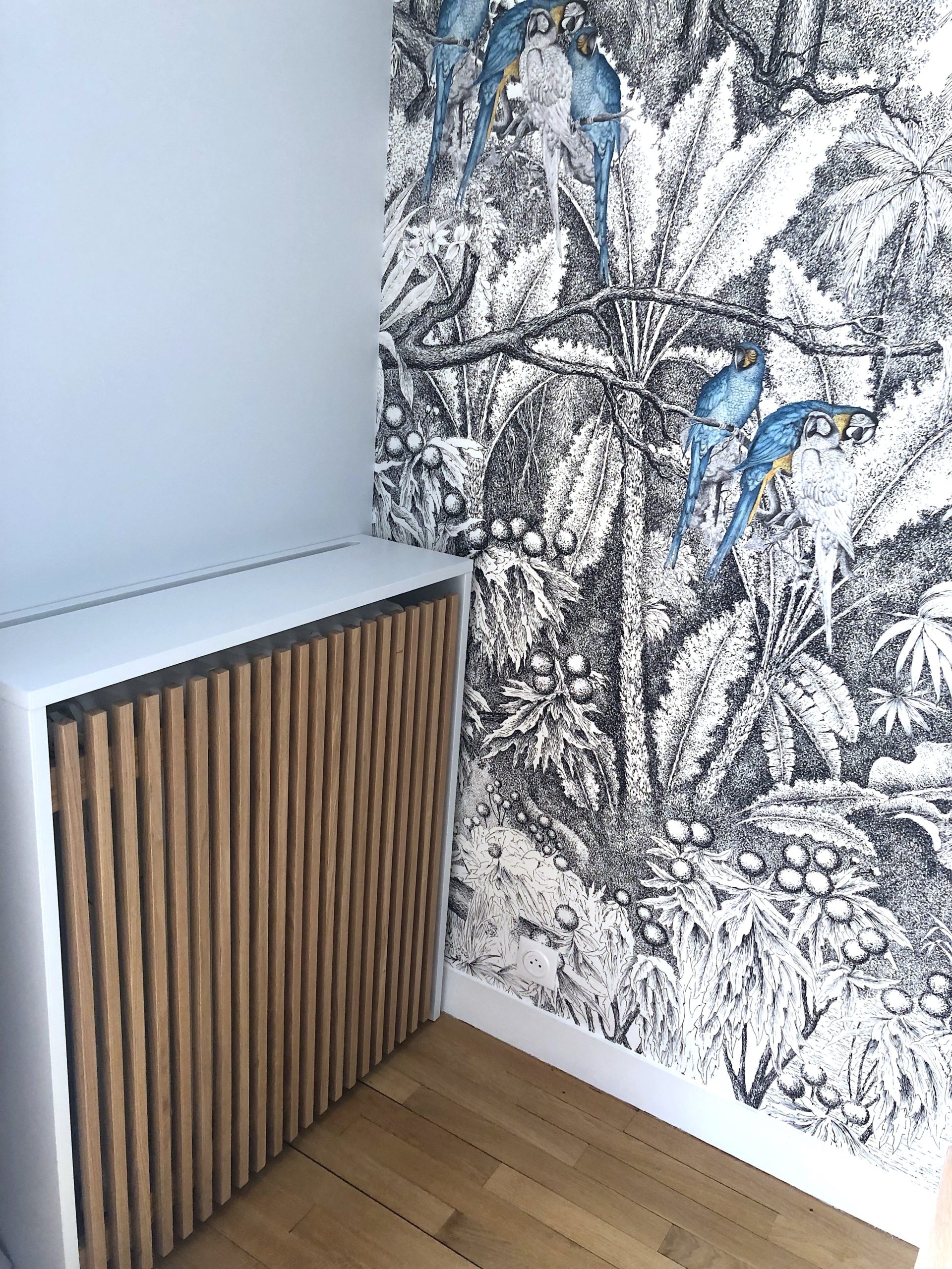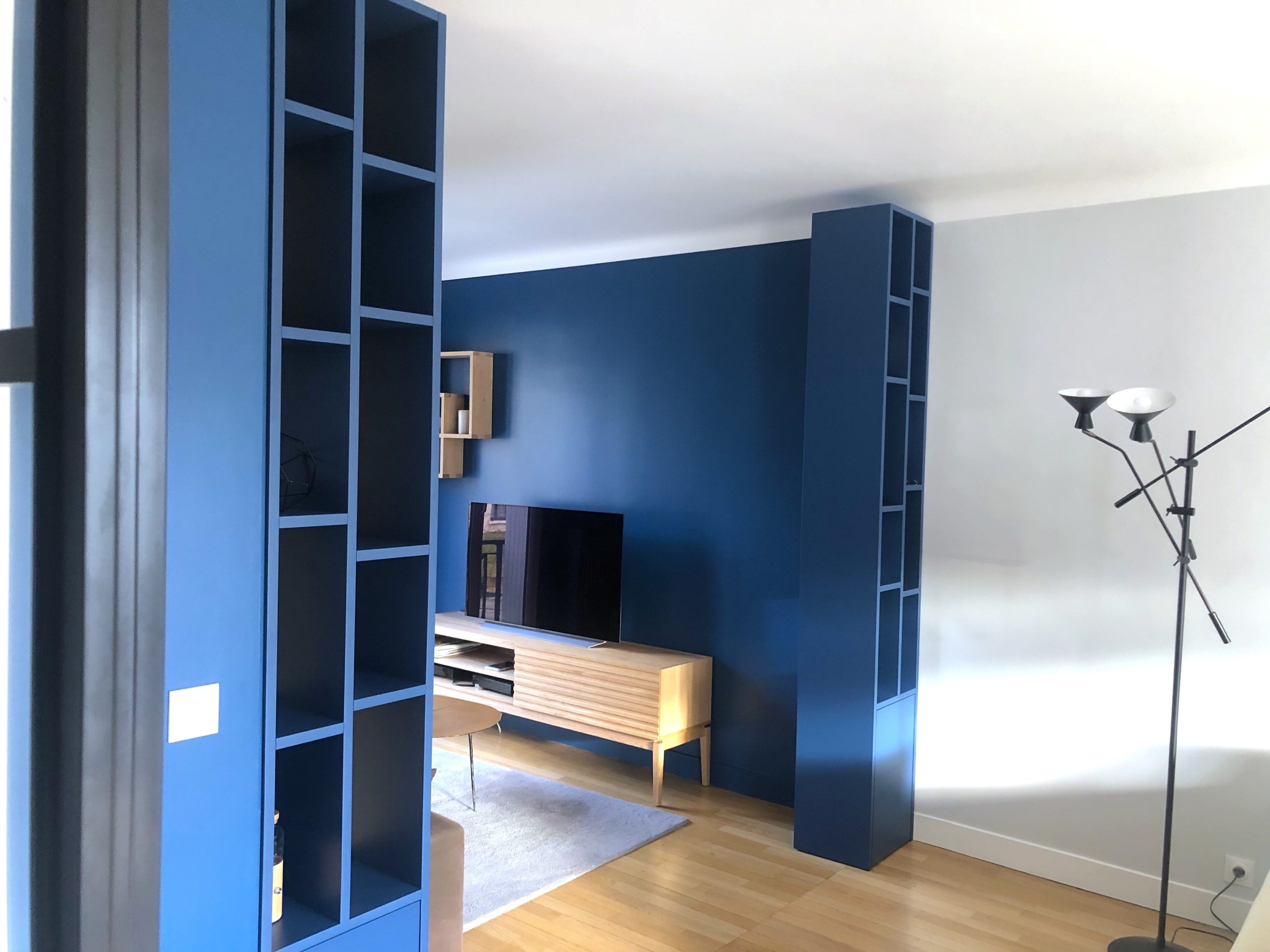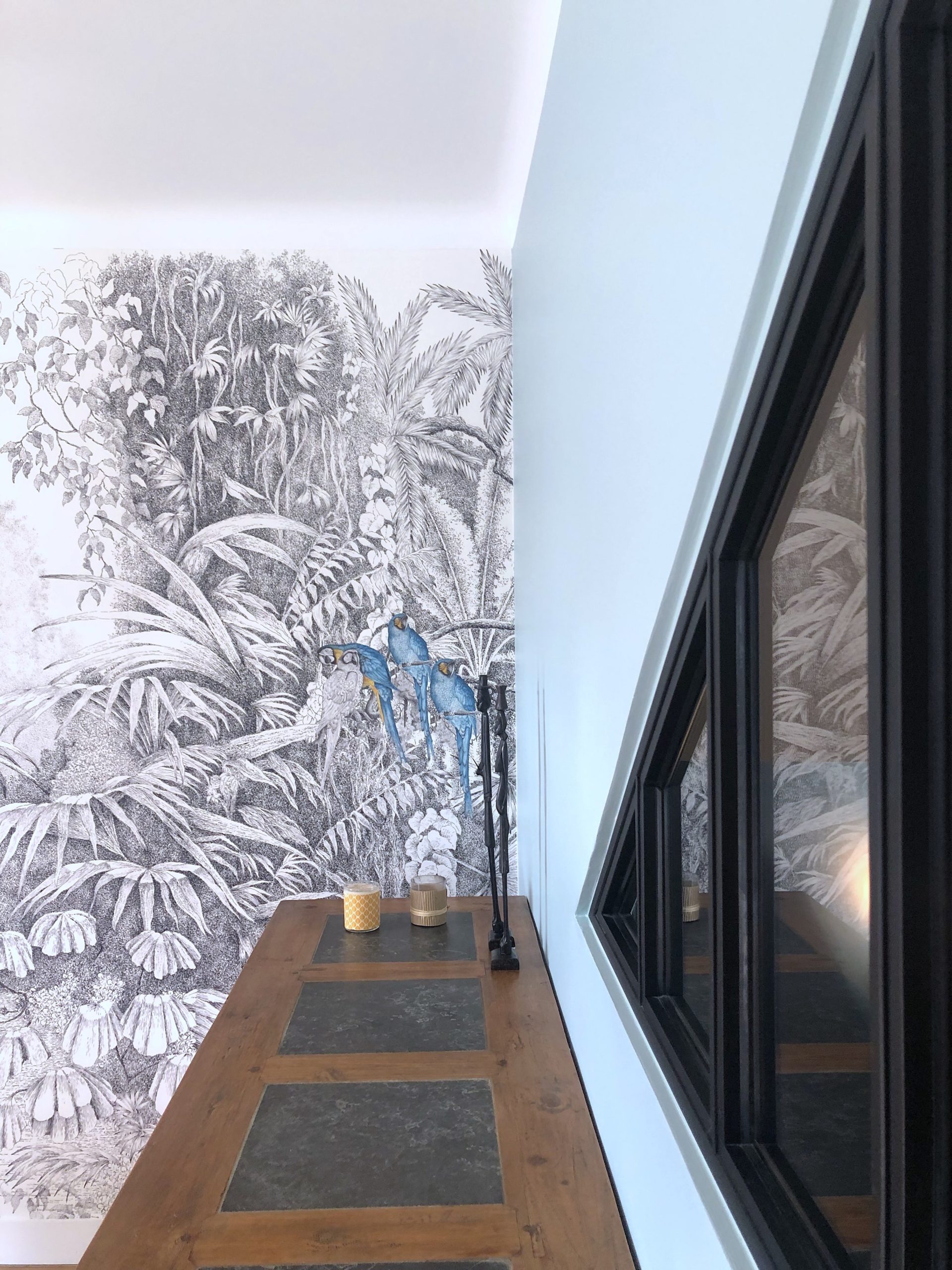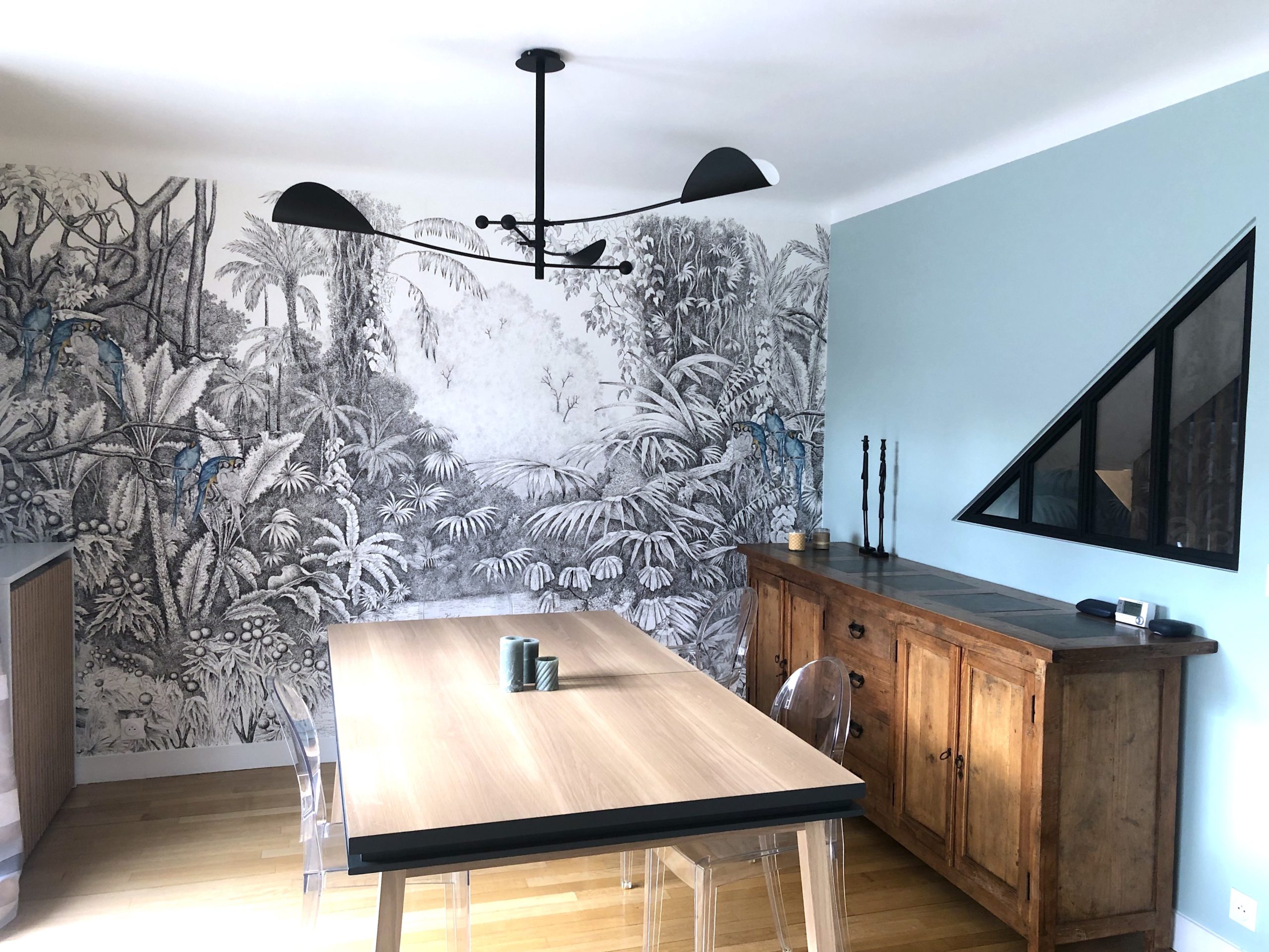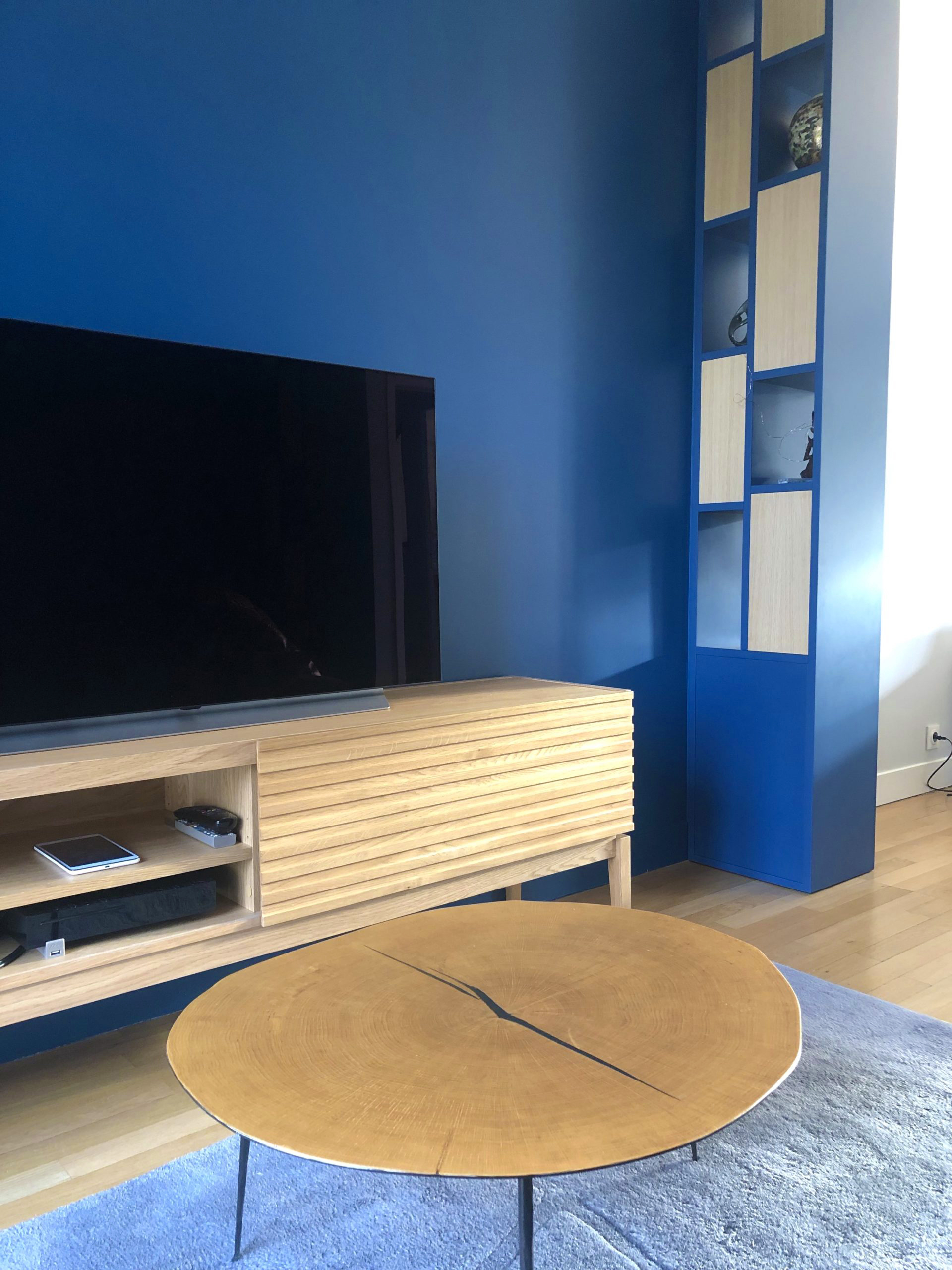 Le projet consistait à entièrement réaménager l’ensemble de l’espace de vie de l’étage ainsi que l’entrée et la très grande cage d’escalier. Dominé par un bleu intense, le coin TV affirme une identité forte et contemporaine. Ce coloris tranche avec la douceur du salon, créant un contraste équilibré et visuellement structurant. Entre ces deux espaces, deux éléments de rangement ont été conçu sur mesure : ils font office de rangement et créent une séparation élégante, redéfinissant les espaces sans les cloisonner. La salle à manger se distingue par un papier peint graphique et raffiné, qui personnalise la pièce.