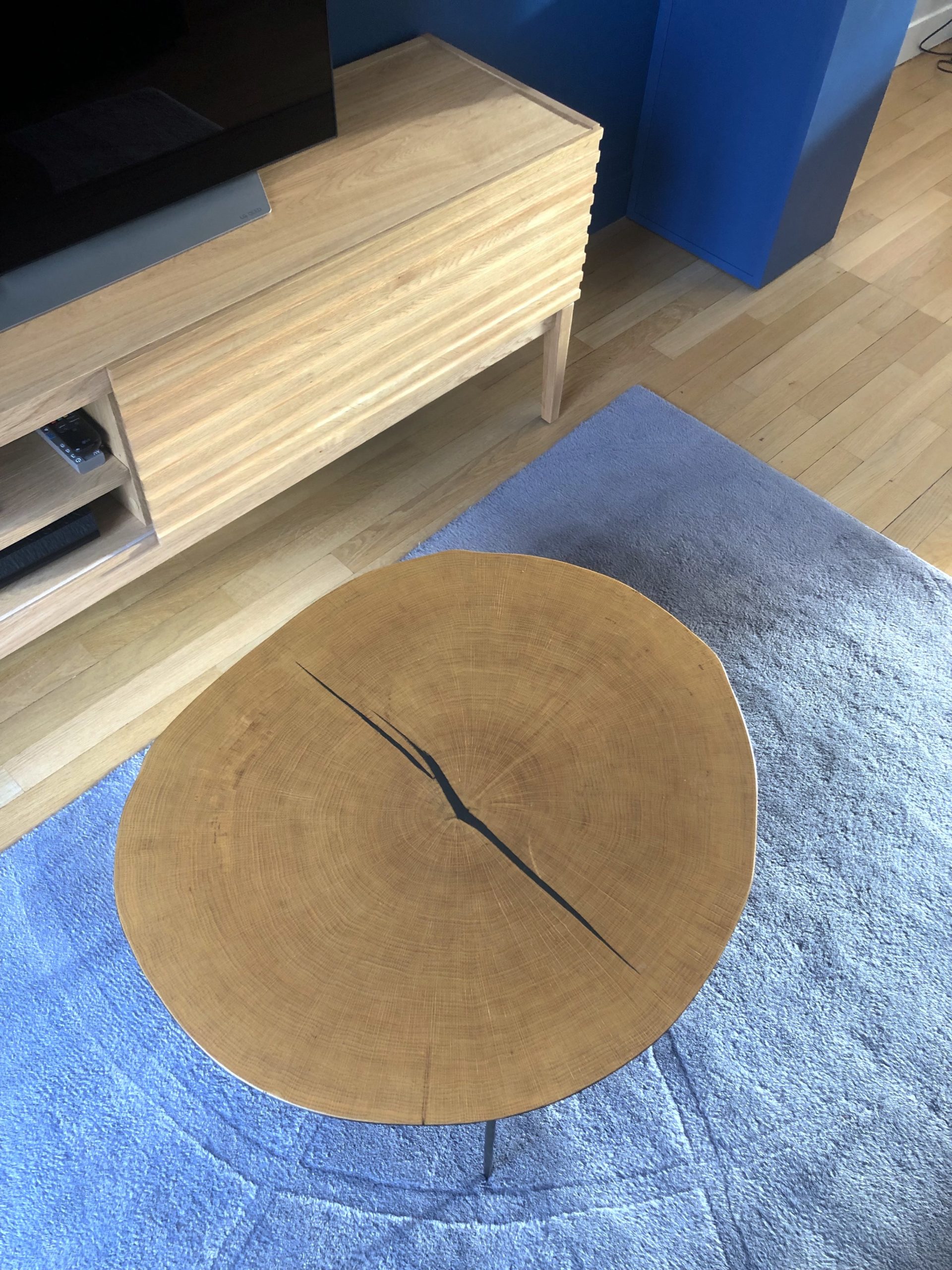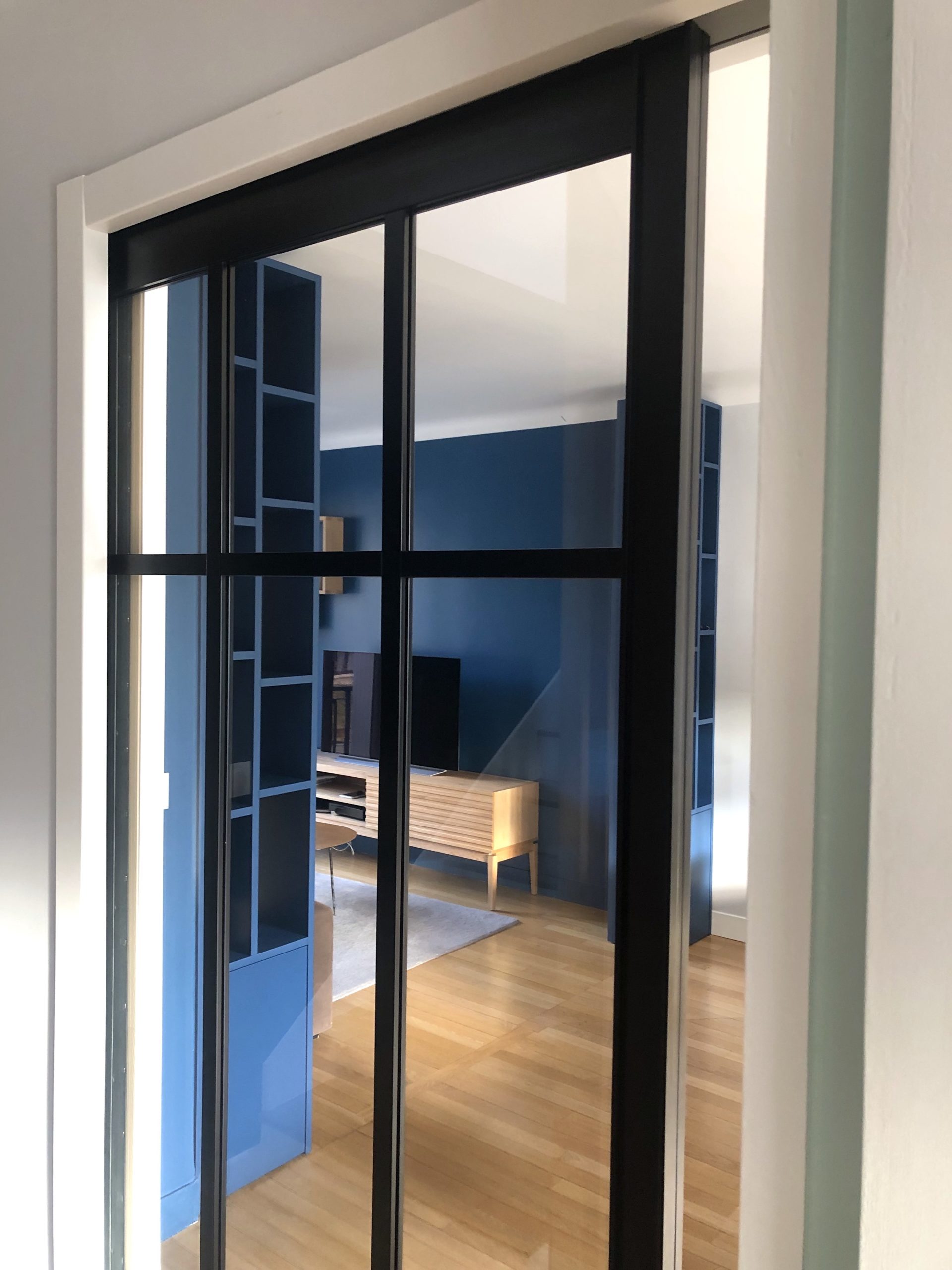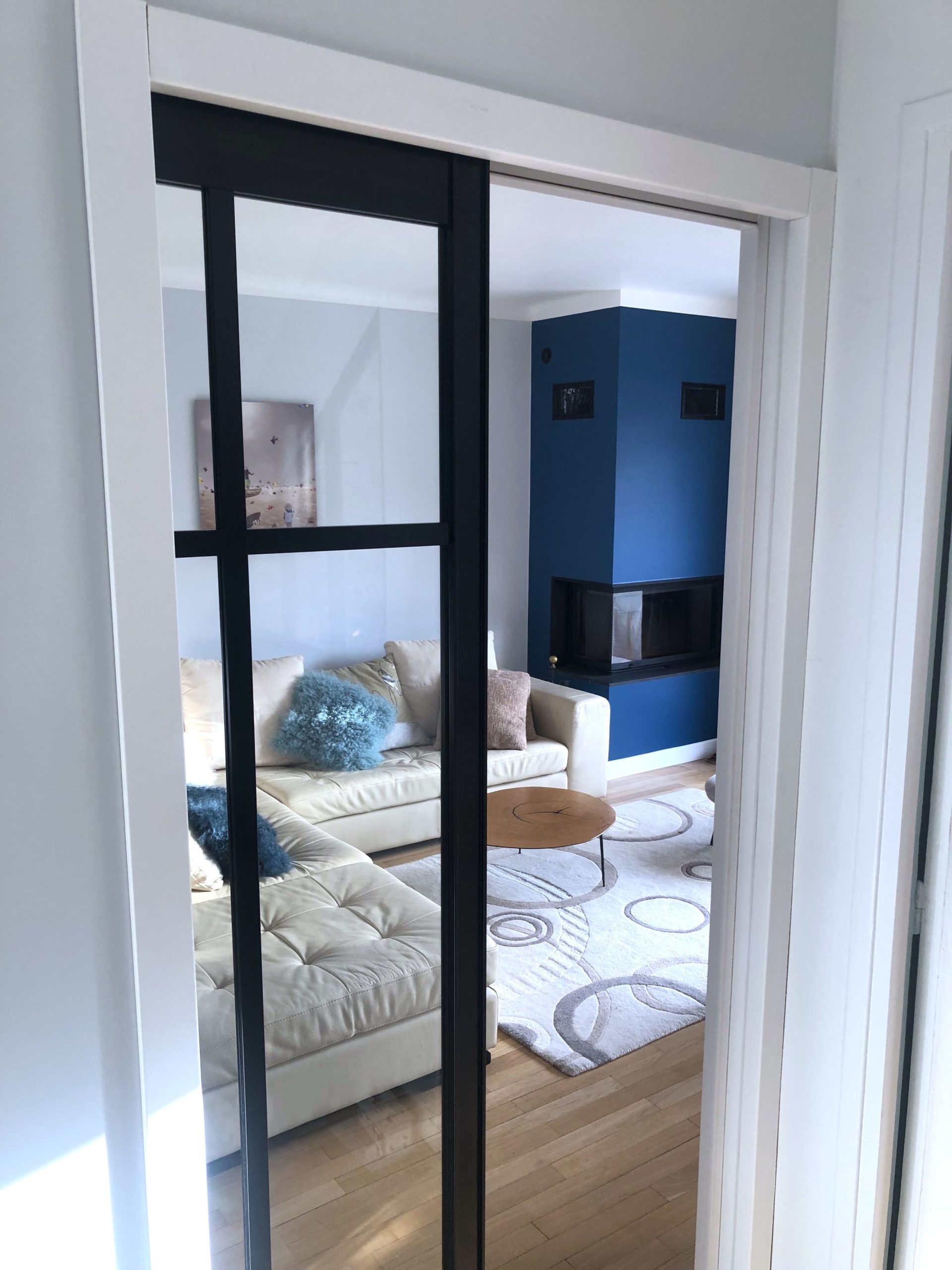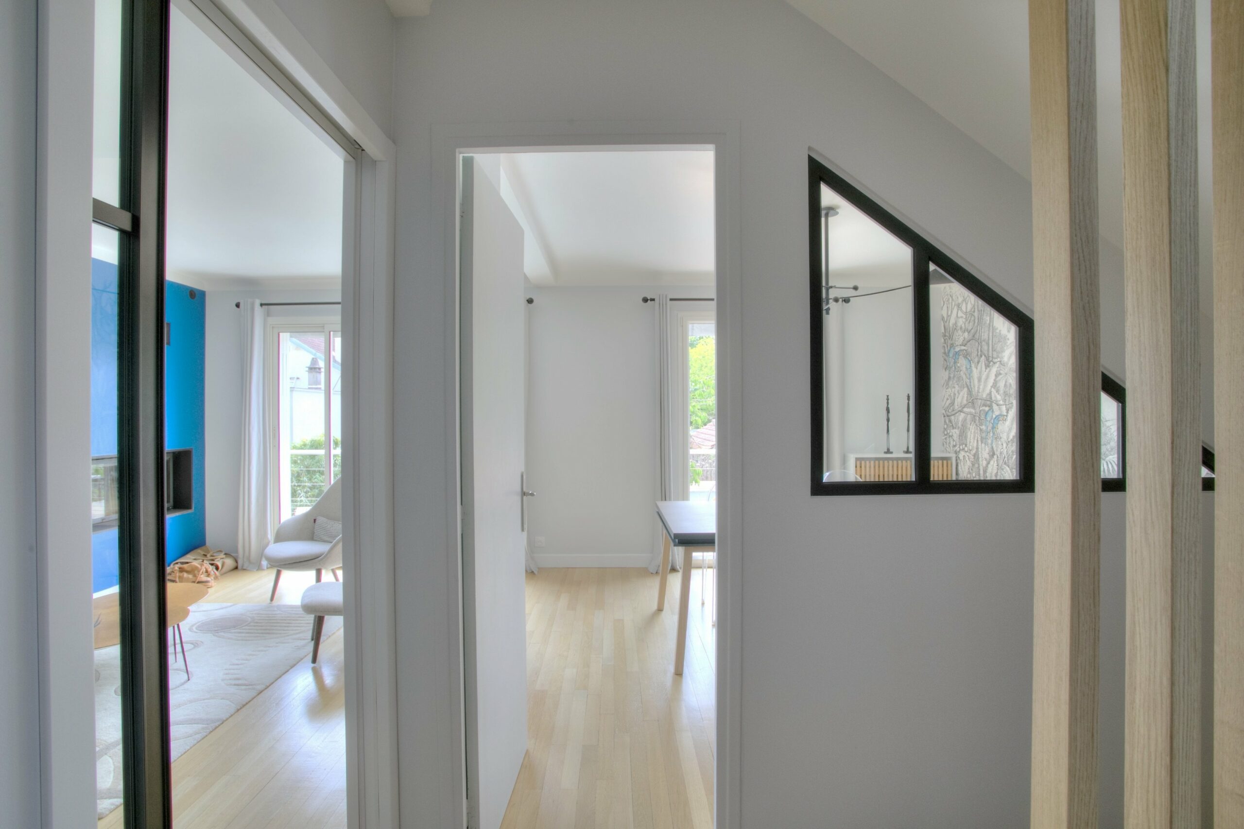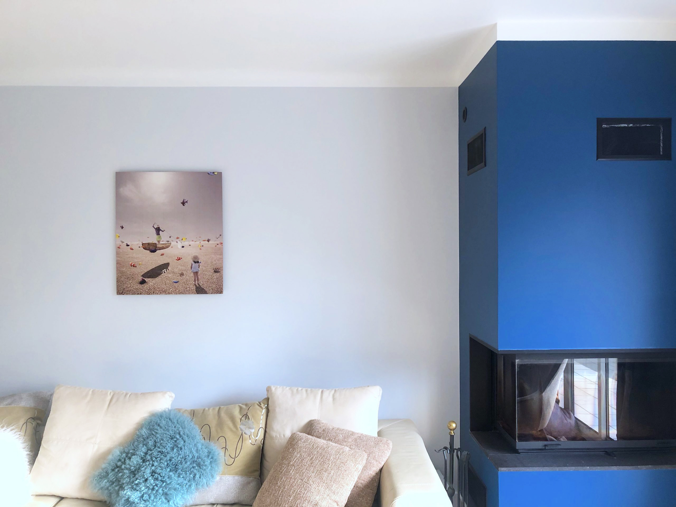 Le projet consistait à entièrement réaménager l’ensemble de l’espace de vie de l’étage ainsi que l’entrée et la très grande cage d’escalier. Dominé par un bleu intense, le coin TV affirme une identité forte et contemporaine. Ce coloris tranche avec la douceur du salon, créant un contraste équilibré et visuellement structurant. Entre ces deux espaces, deux éléments de rangement ont été conçu sur mesure : ils font office de rangement et créent une séparation élégante, redéfinissant les espaces sans les cloisonner. La salle à manger se distingue par un papier peint graphique et raffiné, qui personnalise la pièce.